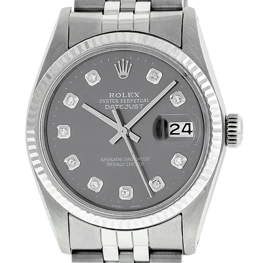 One Mens Pre Owned Stainless Steel Rolex Datejust Polished Bright with Satin Finish, Serviced And Electronically Tested, Rolex Stainless Steel Case: 36mm, Rolex Stainless Steel Crown, Rolex Bezel: White Gold Fluted Bezel. Custom Crystal: New Acrylic With Magnified Date Window. Custom Hands: New Luminescent Hands. Rolex Movement: Automatic Winding Movement 3035. Custom Dial: Custom Slate Grey Dial With Added Diamonds, Diamond Count: 10 Diamonds On Dial. Date Window: 3 O'Clock Position Date Display, Quickset, Model: Datejust, Condition: G-6 Extra Fine. Rolex Bracelet: Stainless Steel Jubilee Band. Bright Polish And Satin Finish. 7.0 Inch Length, Adjustable. Standard Clasp, With Rolex Logo. This Watch Has Been Serviced And Polished It Is Free Of All Scratches And Dents.