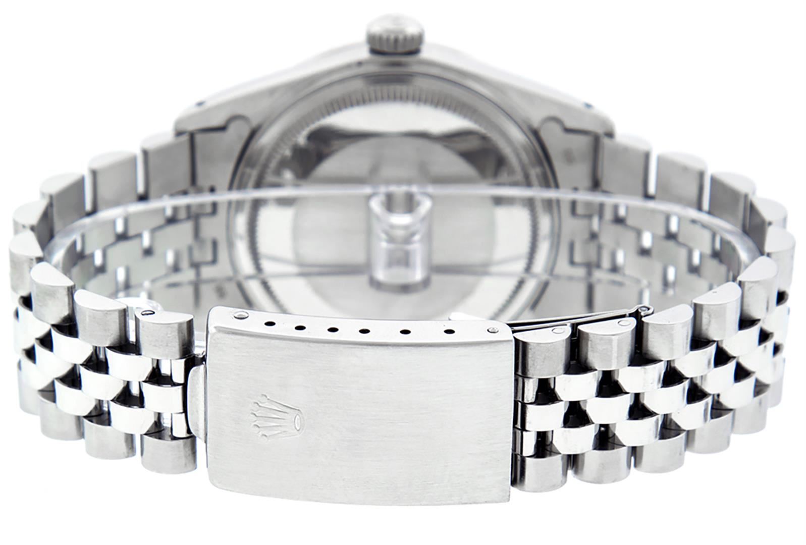 One Mens Stainless Steel Rolex Datejust Polished, Serviced & Electronically Tested, Stainless Steel Case: 36mm, Stainless Steel Crown, Custom Bezel: New 18K White Gold Emerald Beadset Diamond Bezel, Diamond + Gem Count: 36 Diamonds + 4 Emeralds, Total Weight 1.00 Carat, Clarity: SI-VS, Color: G to H. Custom Crystal: New Scratch Resistant Synthetic Sapphire Cyclops Lens. Custom Hands: New Luminescent Hands. Movement: Automatic Winding Movement Caliber 3035. Custom Dial: Slate Grey Diamond Dial, 10 Diamonds in Dial, G To H In Color, Clarity: SI-VS. Date Window: 3 O'Clock Position Date Display, Quickset, Model: Datejust. Condition: G-6 Extra Fine. Bracelet: Stainless Steel Jubilee. Bright Polish & Satin Finish. 7.0 Inch Length, Adjustable. Standard Clasp, With Rolex Logo. This Watch Has Been Serviced Time Tested And Is In Excellent Condition It Is Free Of All Scratches And Dents