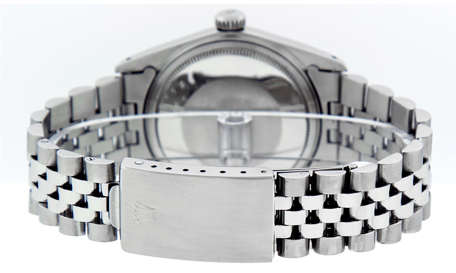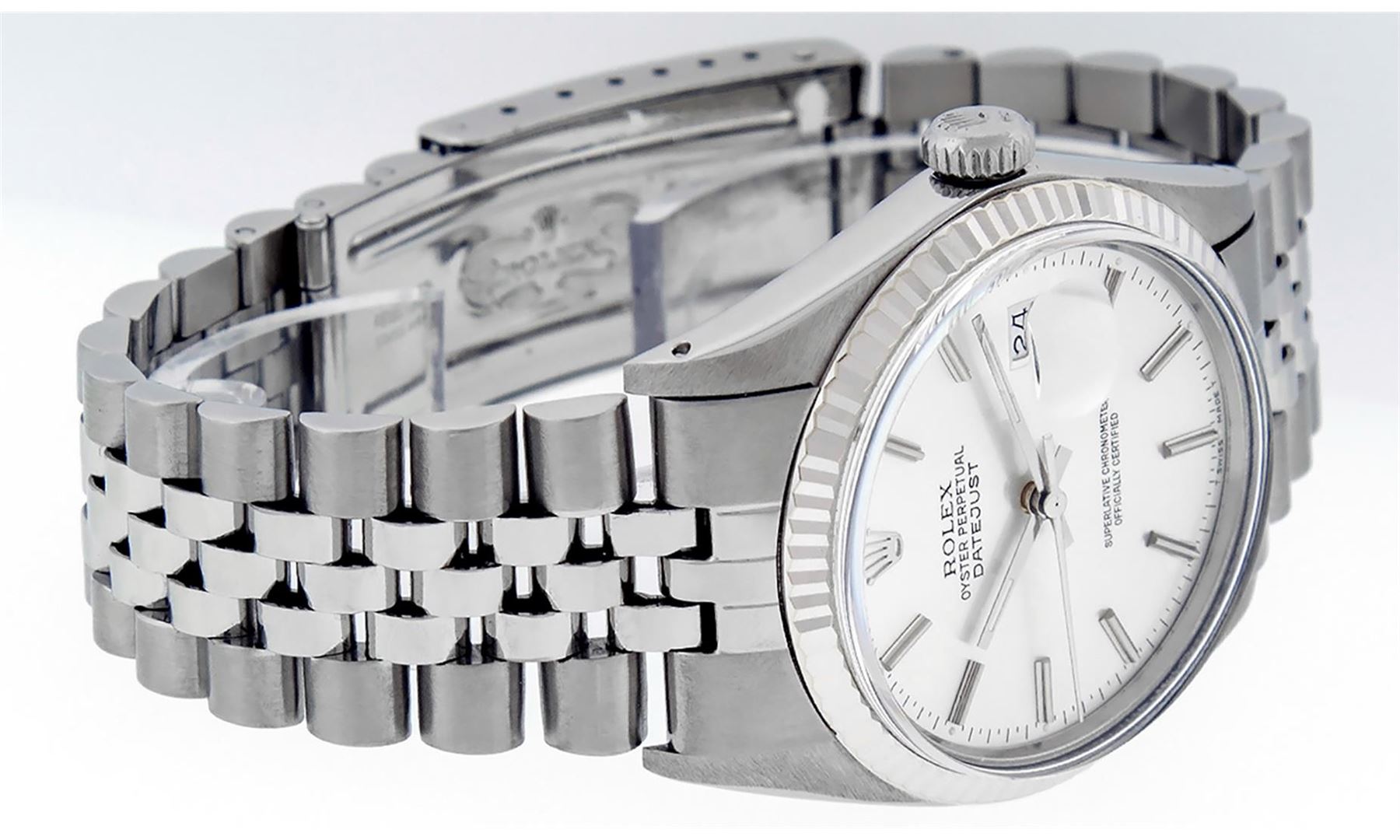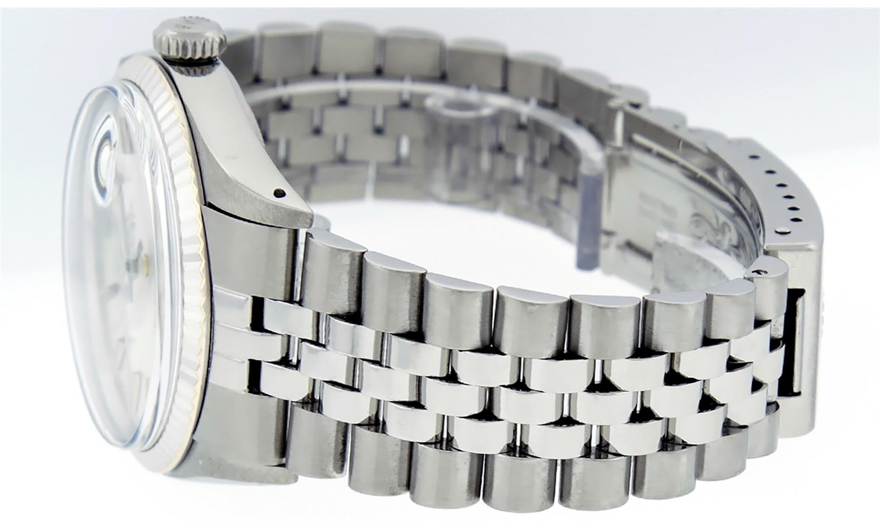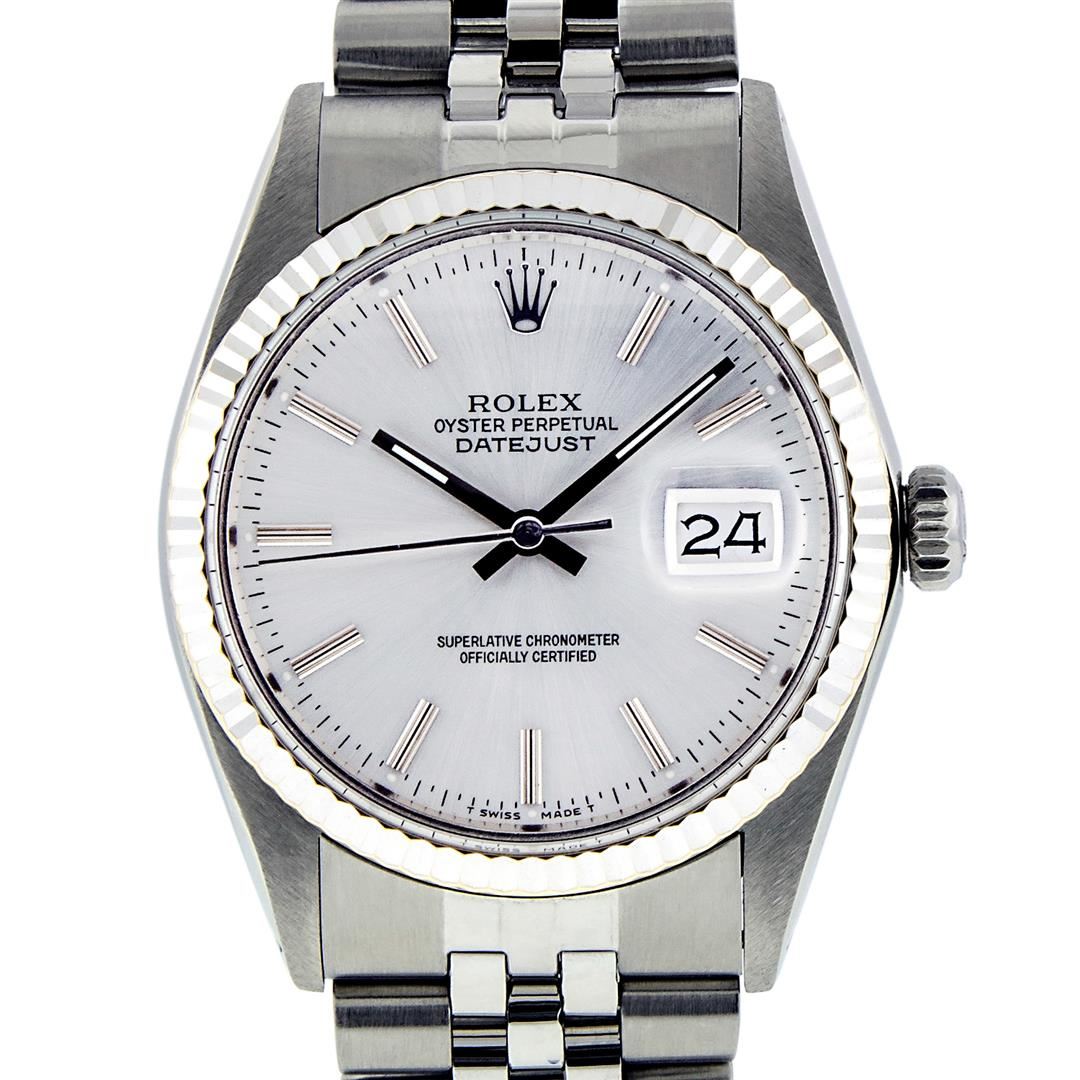 One Mens Pre Owned Stainless Steel Rolex Datejust Polished, Serviced & Electronically Tested, Rolex Stainless Steel Case: 36mm, Rolex Stainless Steel Crown, Rolex Bezel: 14K White Gold Fluted Bezel. Custom Crystal: New Acrylic Cyclops Lens. Hands: Lumines