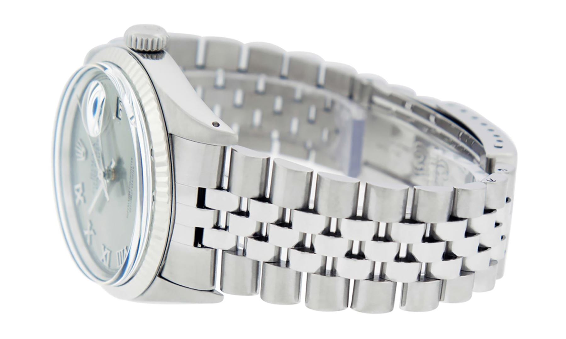 One Mens Pre Owned Stainless Steel Rolex Datejust Polished, Serviced & Electronically Tested, Rolex Stainless Steel Case: 36mm, Rolex Stainless Steel Crown, Rolex Bezel: 14K White Gold Fluted Bezel. Custom Crystal: New Plastic With Date Window. Custom Hands: New Luminescent Hands. Rolex Movement: Automatic Winding Movement 3035. Custom Dial: Refinished To Slate Grey Roman With Square Track. Date Window: 3 O'Clock Position Date Display, Quickset, Model: Datejust, Condition: G-6 Extra Fine. Rolex Bracelet: Stainless Steel Jubilee Band. Bright Polish & Satin Finish. 7.0 Inch Length, Adjustable. Standard Clasp, With Rolex Logo. This Watch Has Been Serviced Time Tested And Is In Excellent Condition It Is Free Of All Scratches And Dents.