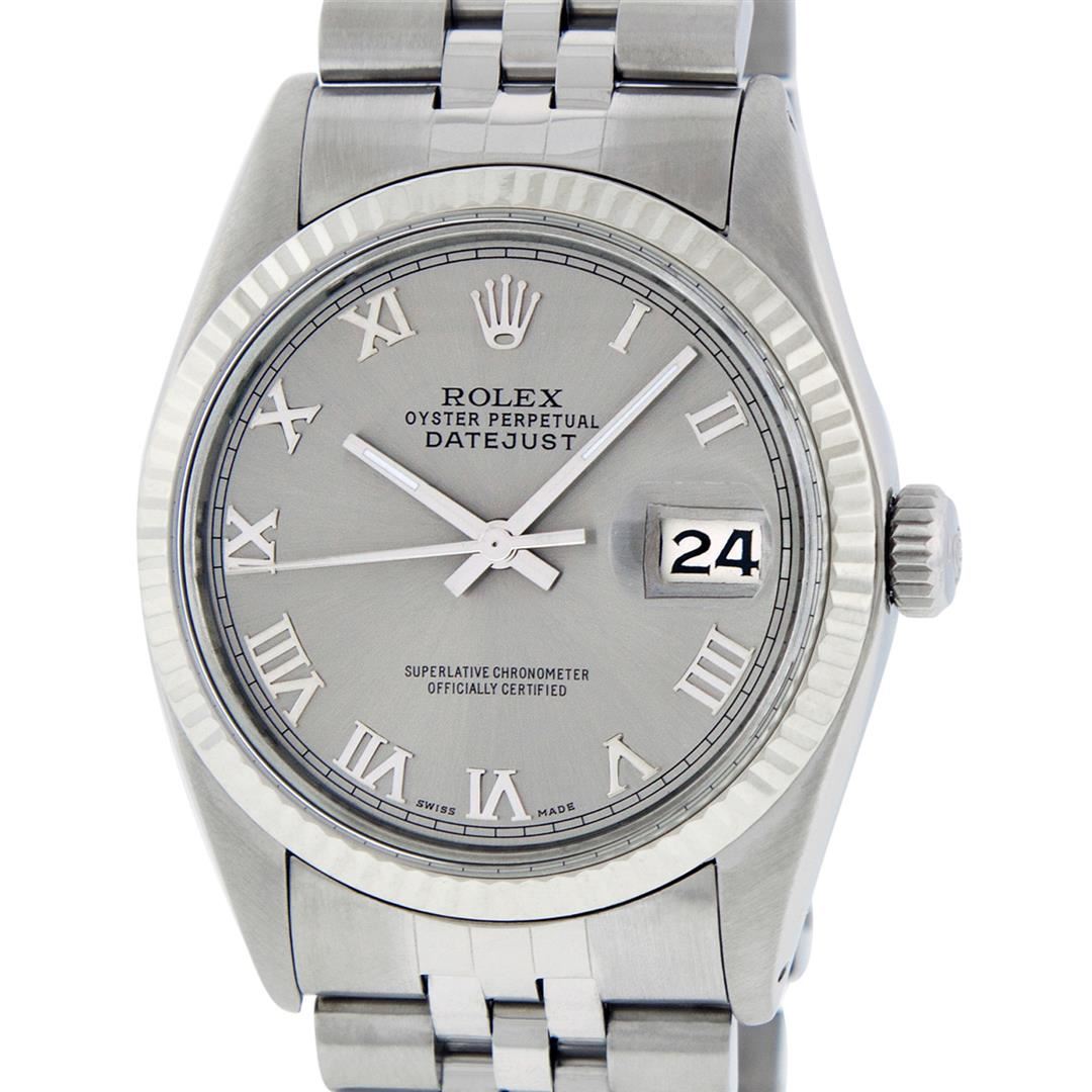 One Mens Pre Owned Stainless Steel Rolex Datejust Polished, Serviced & Electronically Tested, Rolex Stainless Steel Case: 36mm, Rolex Stainless Steel Crown, Rolex Bezel: 14K White Gold Fluted Bezel. Custom Crystal: New Acrylic Cyclops Lens. Custom Hands: New Luminescent Hands. Rolex Movement: Automatic Winding Movement. Custom Dial: Refinished To Slate Grey Roman With Square Track. Date Window: 3 O'Clock Position Date Display, Quickset, Model: Datejust, Condition: G-6 Extra Fine. Rolex Bracelet: Stainless Steel Jubilee Band. Bright Polish & Satin Finish. 7.0 Inch Length, Adjustable. Standard Clasp, With Rolex Logo. This Watch Has Been Serviced Time Tested And Is In Excellent Condition It Is Free Of All Scratches And Dents.