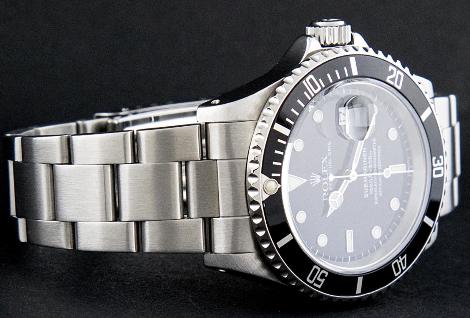 One Mens Pre Owned Rolex Stainless Steel Submariner With Date Polished, Serviced & Electronically Tested, Rolex Stainless Steel Case: 40mm, Rolex Stainless Steel Crown, Rolex Bezel: Stainless Steel Rotatable Bezel With Black Insert. Crystal: Sapphire With Magnified Date Window. Rolex Movement: Automatic Winding Movement Caliber 3135. Rolex Dial: Black Submariner Dial, Hands: Submariner Hands. Date Window: 3 O'Clock Position Date Display, Model: Submariner, Quickset, Condition: G-6 Extra Fine. Rolex Bracelet: Stainless Steel Oyster Band. Bright Polish & Satin Finish. 7.0 Inch Length, Adjustable. Standard Clasp, With Rolex Logo.