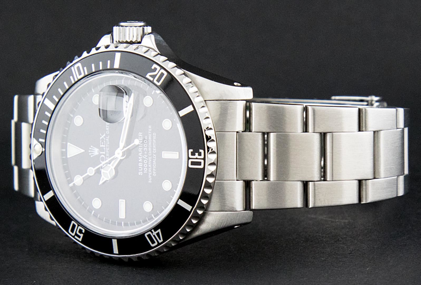 One Mens Pre Owned Rolex Stainless Steel Submariner With Date Polished, Serviced & Electronically Tested, Rolex Stainless Steel Case: 40mm, Rolex Stainless Steel Crown, Rolex Bezel: Stainless Steel Rotatable Bezel With Black Insert. Crystal: Sapphire With Magnified Date Window. Rolex Movement: Automatic Winding Movement Caliber 3135. Rolex Dial: Black Submariner Dial, Hands: Submariner Hands. Date Window: 3 O'Clock Position Date Display, Model: Submariner, Quickset, Condition: G-6 Extra Fine. Rolex Bracelet: Stainless Steel Oyster Band. Bright Polish & Satin Finish. 7.0 Inch Length, Adjustable. Standard Clasp, With Rolex Logo.