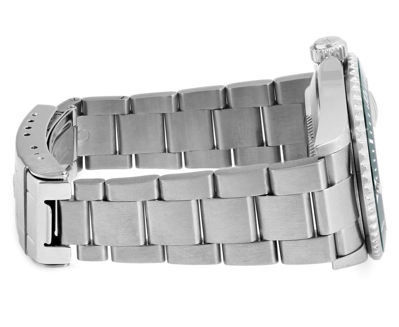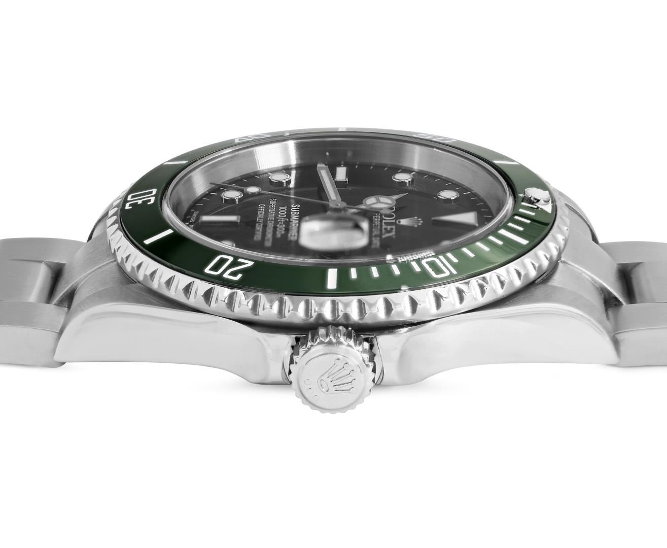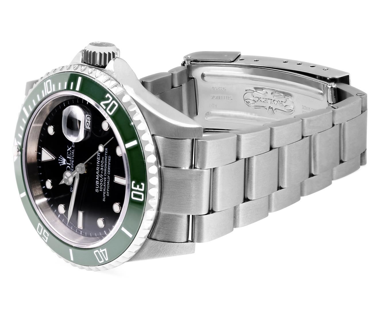 One Mens Pre Owned Rolex Stainless Steel Submariner With Date Polished, Serviced & Electronically Tested, Rolex Stainless Steel Case: 40mm, Rolex Stainless Steel Crown, Rolex Bezel: Stainless Steel Rotatable Bezel. Custom Bezel Insert: New Custom Green Ceramic Insert. Crystal: Sapphire With Magnified Date Window. Rolex Movement: Automatic Winding Movement Caliber 3135. Rolex Dial: Black Submariner Dial with Luminous Index Hour Markers And Dash Track. Date Window: 3 O'Clock Position Date Display, Model: Date No Holes Submariner, Quickset, Condition: G-6 Extra Fine. Rolex Bracelet: Stainless Steel Oyster Band. Bright Polish & Satin Finish. 7.0 Inch Length, Adjustable. Fold Clasp, With Rolex Logo. This Watch Comes With A Rolex Box.