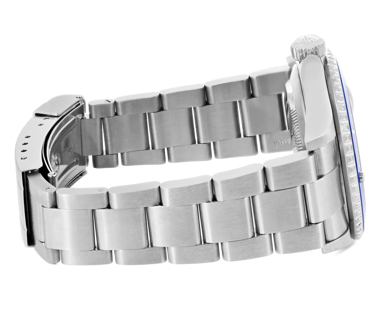 One Mens Pre Owned Rolex Stainless Steel Submariner With Date Polished, Serviced & Electronically Tested, Rolex Stainless Steel Case: 40mm, Rolex Stainless Steel Crown, Rolex Bezel: Stainless Steel Rotatable Bezel. Custom Bezel Insert: New Custom Blue Ceramic Insert. Crystal: Sapphire With Magnified Date Window. Rolex Movement: Automatic Winding Movement Caliber 3135. Rolex Dial: Black Submariner Dial with Luminous Index Hour Markers And Dash Track. Date Window: 3 O'Clock Position Date Display, Model: Date No Holes Submariner, Quickset, Condition: G-6 Extra Fine. Rolex Bracelet: Stainless Steel Oyster Band. Bright Polish & Satin Finish. 7.0 Inch Length, Adjustable. Fold Clasp, With Rolex Logo. This Watch Comes With A Rolex Box.