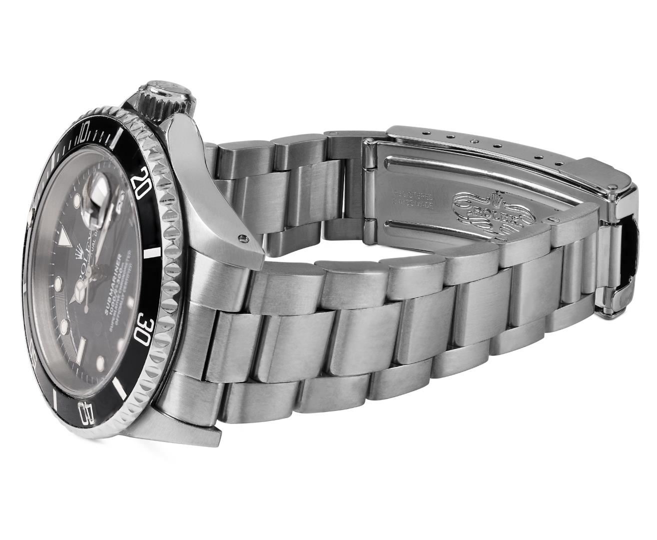 One Mens Pre Owned Stainless Rolex Submariner With Date Polished, Serviced & Electronically Tested, Rolex Stainless Steel Case: 40mm, Rolex Stainless Steel Crown, Rolex Bezel: Stainless Steel Rotatable Bezel With Black Insert. Crystal: Sapphire With Magnified Date Window. Rolex Movement: Automatic Winding Movement Caliber 3135. Rolex Dial: Black Submariner Dial with Luminous Index Hour Markers And Dash Track. Date Window: 3 O'Clock Position Date Display, Model: Date Submariner, Quickset, Condition: G-6 Extra Fine. Rolex Bracelet: Stainless Steel Oyster Band. Bright Polish & Satin Finish. 7.0 Inch Length, Adjustable. Fold Clasp, With Rolex Logo. This Watch Comes With A Rolex Box.