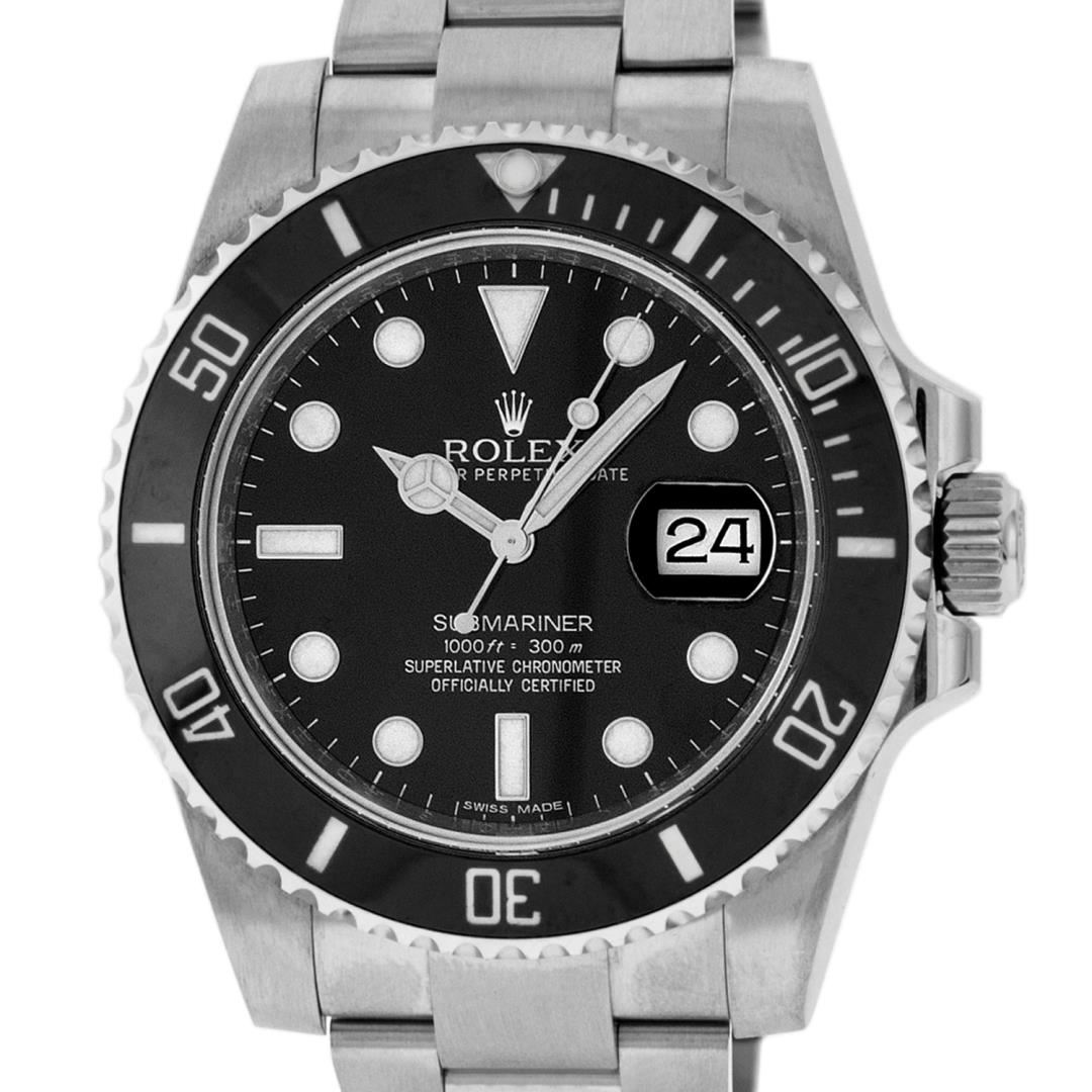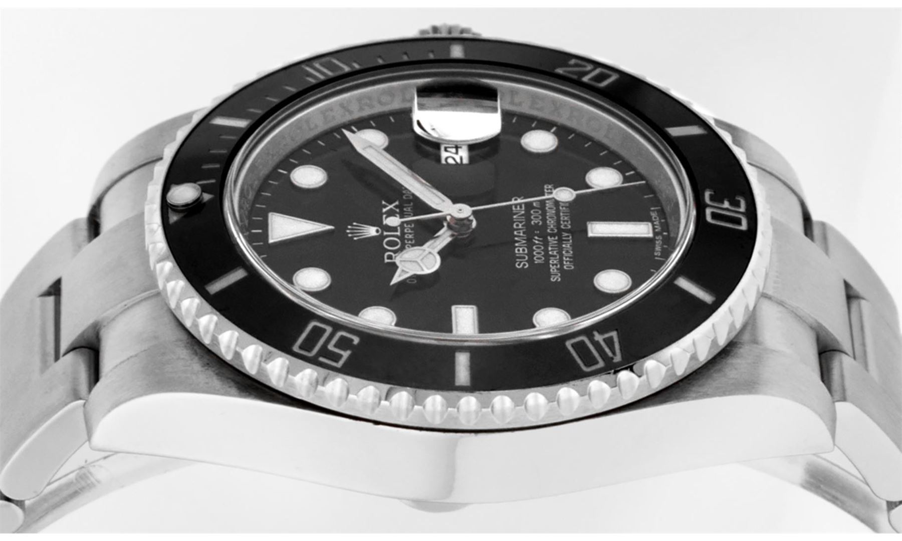 One Mens Pre Owned Ceramic Rolex Submariner With Date Polished, Serviced & Electronically Tested, Rolex Stainless Steel Case: 40mm, Rolex Stainless Steel Crown, Rolex Bezel: Stainless Steel Rotatable Bezel With Black Ceramic Insert. Rolex Crystal: Sapphire Cyclops Lens. Rolex Movement: Automatic Winding Movement Caliber 3135. Rolex Dial: Rolex Black Submariner Dial with Luminous Index Hour Markers. Date Window: 3 O'Clock Position Date Display, Model: Ceramic Submariner, Quickset, Condition: G-6 Extra Fine. Rolex Bracelet: Stainless Steel Oyster Band. Bright Polish & Satin Finish. 7.0 Inch Length, Adjustable. Standard Clasp, With Rolex Logo.