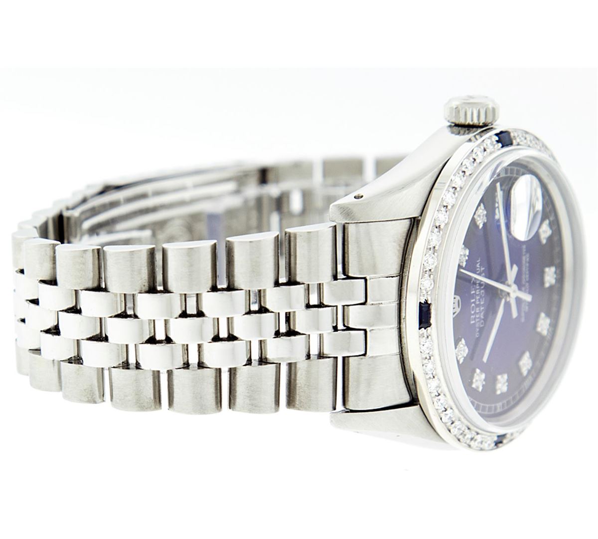 One Mens Rolex Datejust Polished, Serviced & Electronically Tested, Stainless Steel Case:36mm, Stainless Steel Crown, Custom Bezel: 18K White Gold Sapphire Beadset Diamond Bezel, Diamond + Gem Count: 36 Diamonds + 4 Sapphires Total Weight 1.00 Carat, Clarity: SI-VS, Color: G to H. Custom Crystal: Synthetic Sapphire Cyclops Lens. Movement: Automatic Winding Movement Caliber 3035. Custom Dial: Blue Vignette With VVS Diamond Hour Markers and Roman Square Track, 10 Diamond Dial G To H In Color, Clarity: VVS. Date Window: 3 O'Clock Position Date Display, Quickset, Model: Datejust, Condition: G-6 Extra Fine. Bracelet: Stainless Steel Jubilee. Bright Polish & Satin Finish. 7.0 Inch Length, Adjustable. Standard Clasp, With Rolex Logo.