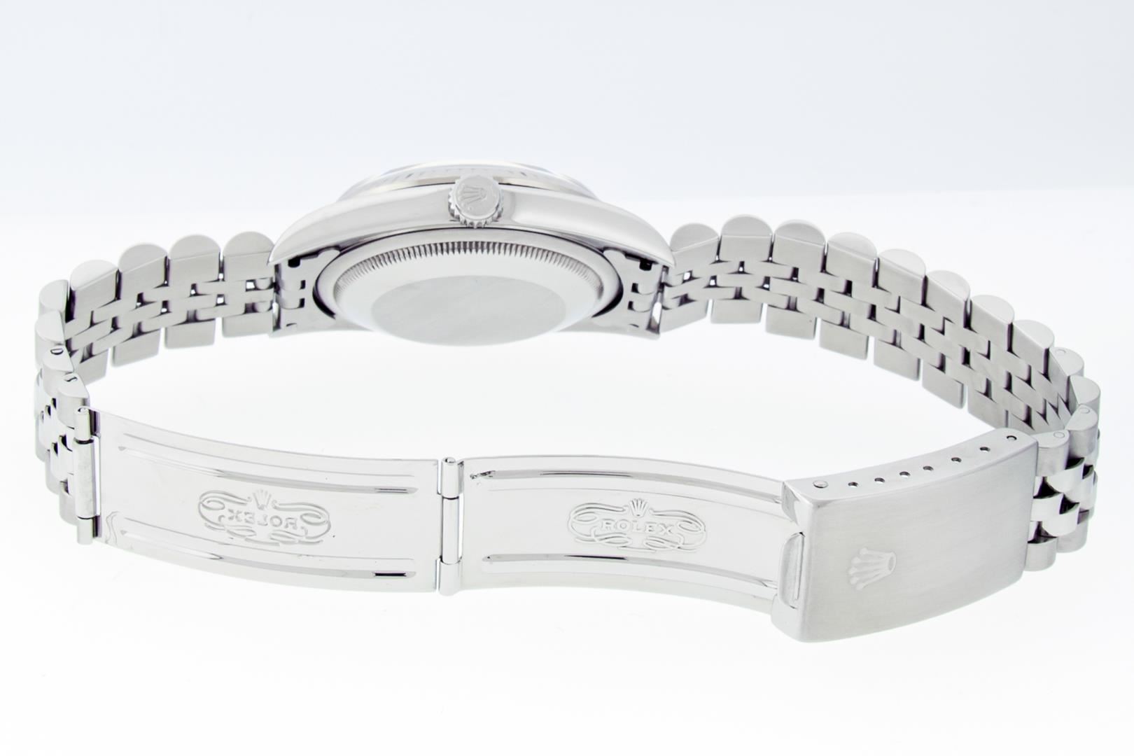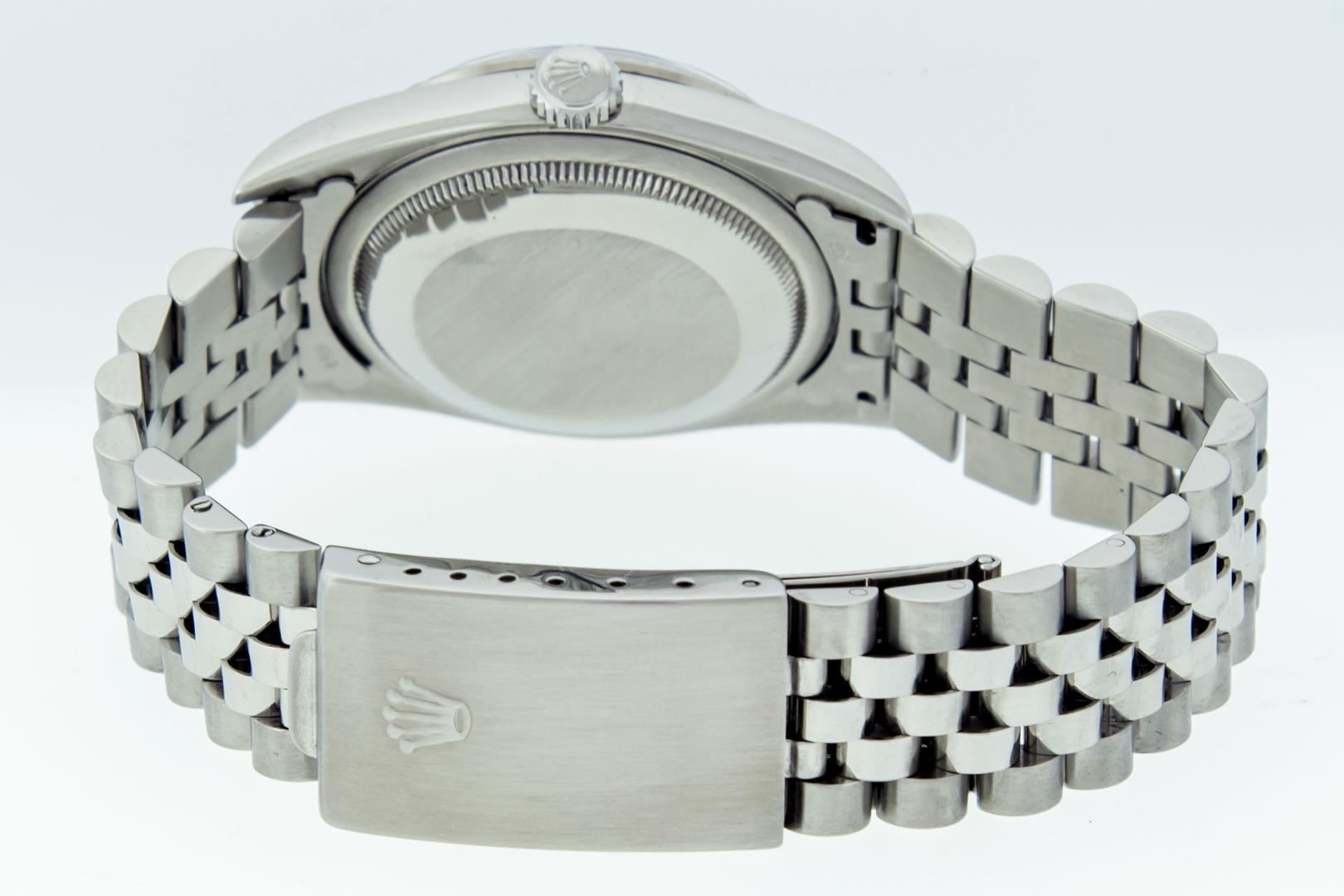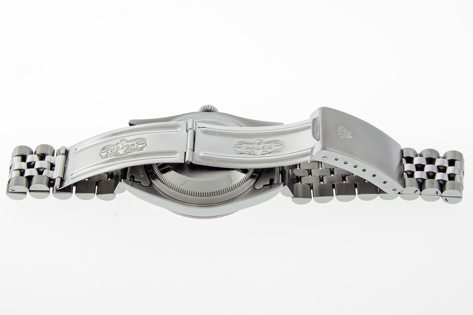 One Mens Pre Owned Stainless Steel Rolex Datejust Polished Bright with Satin Finish, This Watch Has Been Serviced & Electronically Tested, Rolex Stainless Steel Case: 36mm, Rolex Stainless Steel Crown, Rolex Bezel: 18K White Gold Fluted Bezel. Custom Crystal: New Sapphire With Magnified Date Window. Custom Hands: New Luminescent Hands. Rolex Movement: Automatic Winding Movement Caliber 3135. Custom Dial: White Index With Square Track. Date Window: 3 O'Clock Position Date Display, Quickset, Model: Sapphire Datejust, Condition: G-6 Extra Fine. Rolex Bracelet: Stainless Steel Jubilee Band. Bright Polish & Satin Finish. 7.0 Inch Length, Adjustable. Standard Clasp, With Rolex Logo. This Watch Has Been Serviced Time Tested And Is In Excellent Condition It Is Free Of All Scratches And Dents. This Watch Comes With Rolex Box, Booklets, Hang Tag, & Wallet.