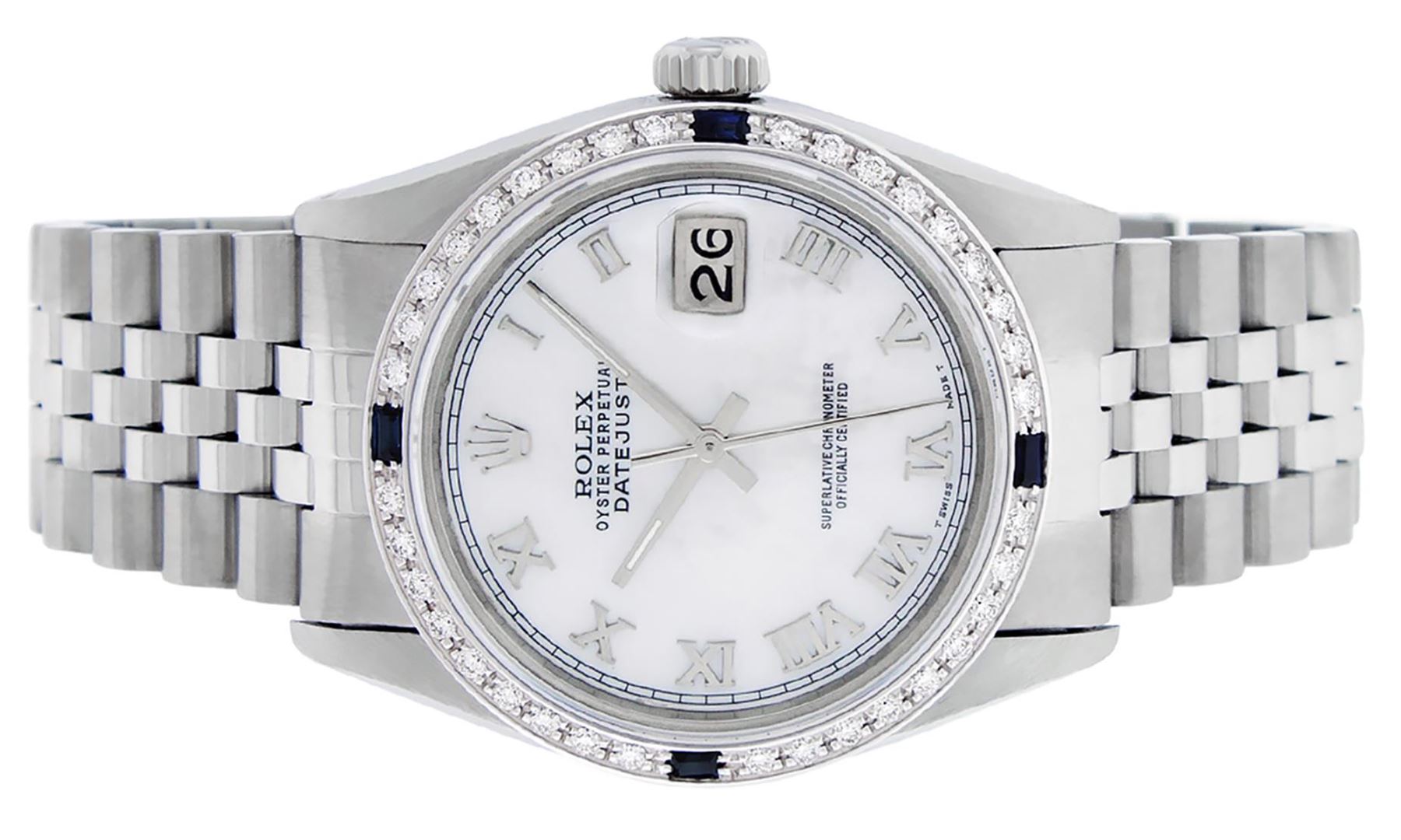 One Mens Pre Owned Stainless Steel Rolex Datejust Polished Bright with Satin Finish, Rolex Stainless Steel Case: 36mm, Rolex Stainless Steel Crown, Custom Bezel: New 18K White Gold Sapphire Beadset Diamond Bezel, Diamond + Gem Count: 36 Diamonds + 4 Sapphires. Custom Crystal: New Sapphire Magnified Date Window. Custom Hands: New Luminescent Hands. Rolex Movement: Automatic Winding Movement 3035. Custom Dial: Custom White Dial With Roman Track. Date Window: 3 O'Clock Position Date Display, Quickset, Model: Datejust, Condition: G-6 Extra Fine. Rolex Bracelet: Stainless Steel Jubilee Band. Rolex Bracelet: 7.0 Inch Length, Adjustable. Standard Clasp, With Rolex Logo. This Watch Has Been Serviced Time Tested And Is In Excellent Condition It Is Free Of All Scratches And Dents.