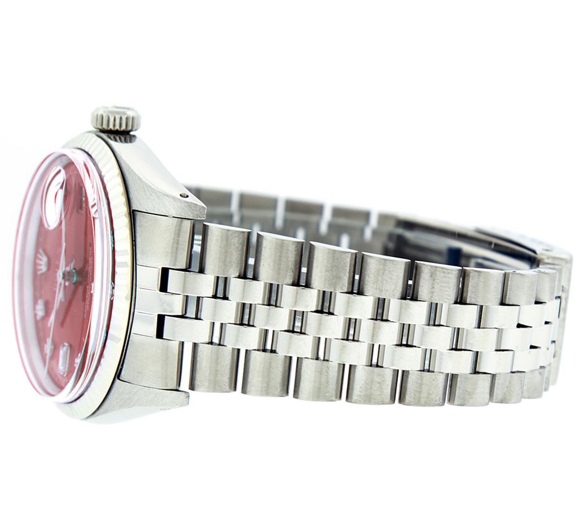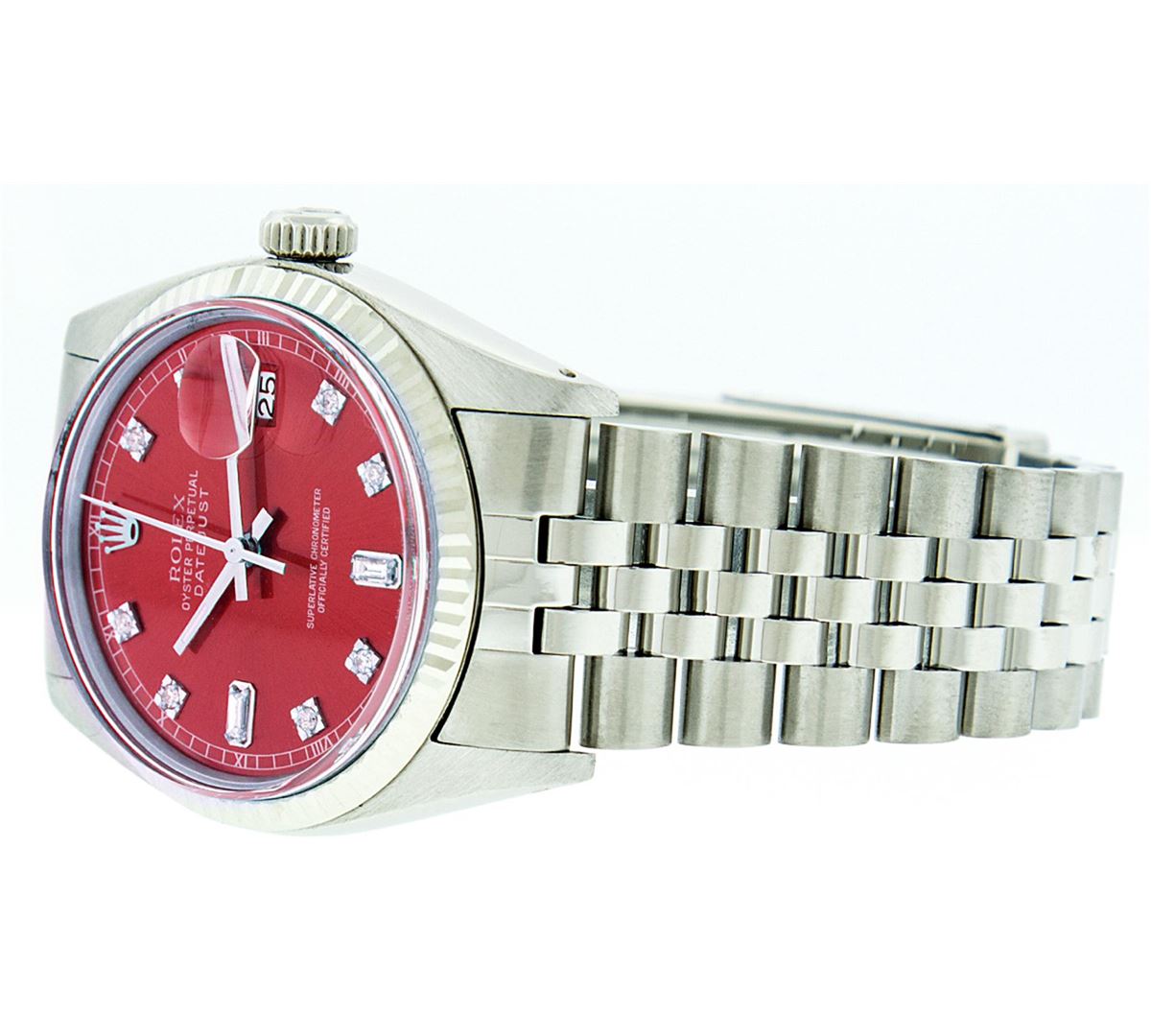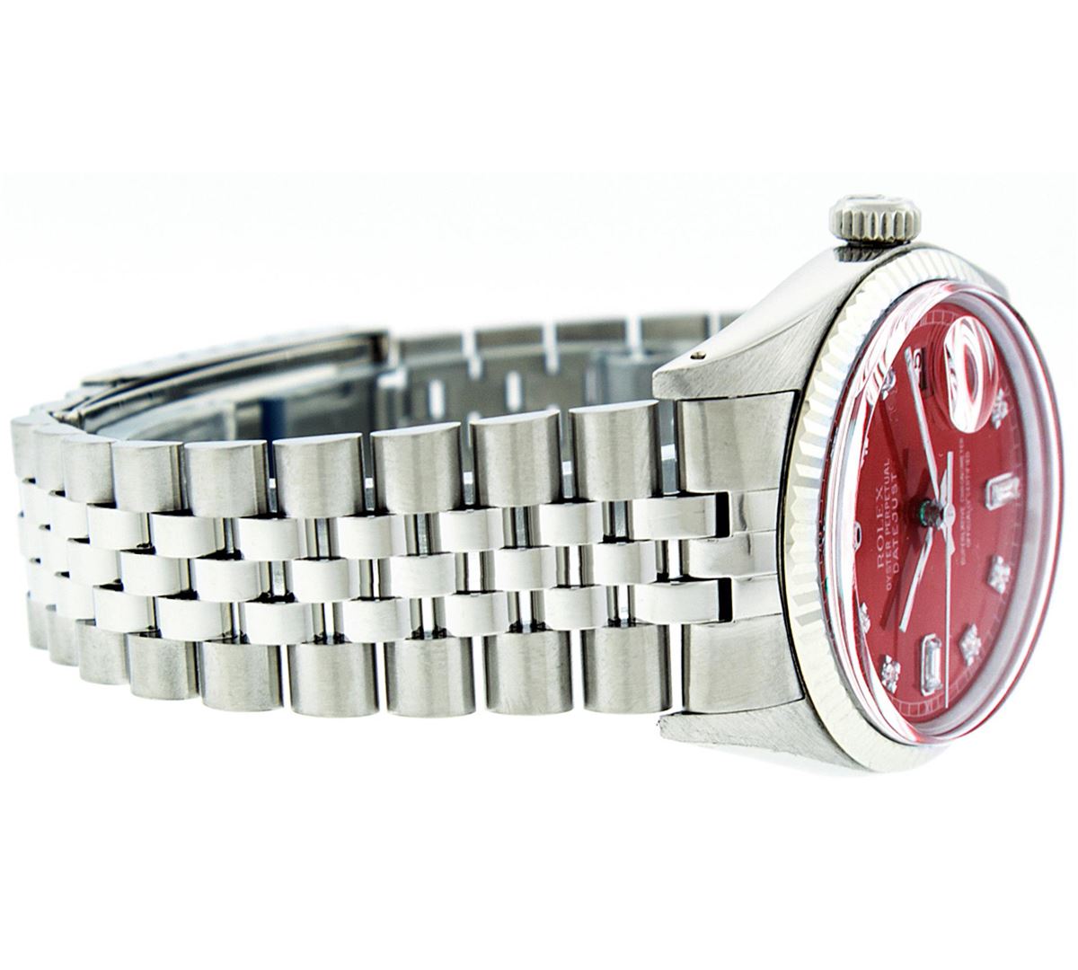 One Mens Rolex Datejust Polished, Serviced & Electronically Tested, Stainless Steel Case:36mm, Stainless Steel Crown, Bezel: 18K White Gold Fluted Bezel. Custom Crystal: Acrylic Cyclops Lens. Movement: Automatic Winding Movement Caliber 3035. Custom Dial: Red With Diamond Hour Markers And Square Roman Track Square Setting, Diamond Count: 8 Diamonds + 2 Baguettes, Clarity: SI-VS, Color: G to H. Date Window: 3 O'Clock Position Date Display, Quickset, Model: Datejust Condition: G-6 Extra Fine. Bracelet: Stainless Steel Jubilee. Bright Polish & Satin Finish. 7.0 Inch Length, Adjustable. Standard Clasp, With Rolex Logo.