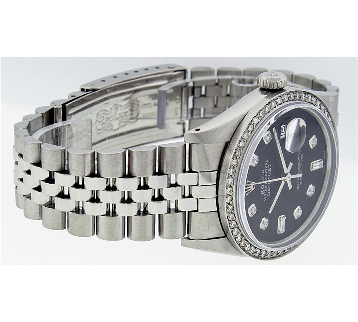 One Mens Rolex Datejust Polished Bright with Satin Finish, Serviced & Electronically Tested, Stainless Steel Case:36mm, Stainless Steel Crown, Custom Bezel: Stainless Steel Beadset Diamond Bezel, Diamond Count: 54 Diamonds Total Weight .90 Carat, Clarity: SI-VS, Color: G to H. Custom Crystal: Synthetic Sapphire Cyclops Lens. Movement: Automatic Winding Movement Caliber 3035. Custom Dial: Black Diamond 8 + 2, Diamond Count: 8 Diamonds + 2 Baguettes, Diamond Color: G to H, VS2 Si1. Date Window: 3 O'Clock Position Date Display, Quickset, Model: Datejust. Condition: G-6 Extra Fine. Bracelet:Stainless Steel Jubilee. Bright Polish & Satin Finish. 7.0 Inch Length, Adjustable. Standard Clasp, With Rolex Logo.