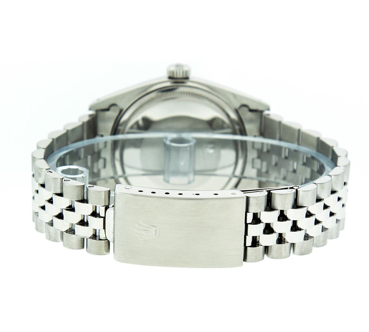 One Mens Rolex Datejust Polished, Serviced & Electronically Tested, Stainless Steel Case:36mm, Stainless Steel Crown, Custom Bezel: 18K White Gold Fluted Bezel. Custom Crystal: Acrylic Cyclops Lens. Movement: Automatic Winding Movement Caliber 3035. Custom Dial: Dark Rhodium With Diamond Hour Markers And Square Roman Track Square Setting, Diamond Count: 8 Diamonds + 2 Baguettes, Clarity: SI-VS, Color: G to H. Date Window: 3 O'Clock Position Date Display, Quickset, Model: Datejust Condition: G-6 Extra Fine. Bracelet: Stainless Steel Jubilee. Bright Polish & Satin Finish. 7.0 Inch Length, Adjustable. Standard Clasp, With Rolex Logo.