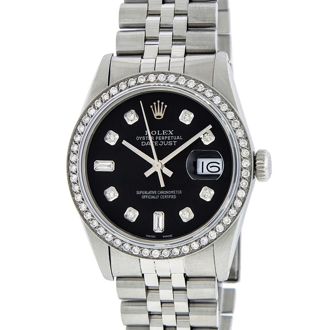 One Mens Rolex Datejust Polished Bright with Satin Finish, Serviced & Electronically Tested, Stainless Steel Case:36mm, Stainless Steel Crown, Custom Bezel: Stainless Steel Beadset Diamond Bezel, Diamond Count: 54 Diamonds Total Weight .90 Carat, Clarity: SI-VS, Color: G to H. Custom Crystal: Synthetic Sapphire Cyclops Lens. Movement: Automatic Winding Movement Caliber 3035. Custom Dial: Black Diamond 8 + 2, Diamond Count: 8 Diamonds + 2 Baguettes, Diamond Color: G to H, VS2 Si1. Date Window: 3 O'Clock Position Date Display, Quickset, Model: Datejust. Condition: G-6 Extra Fine. Bracelet:Stainless Steel Jubilee. Bright Polish & Satin Finish. 7.0 Inch Length, Adjustable. Standard Clasp, With Rolex Logo.
