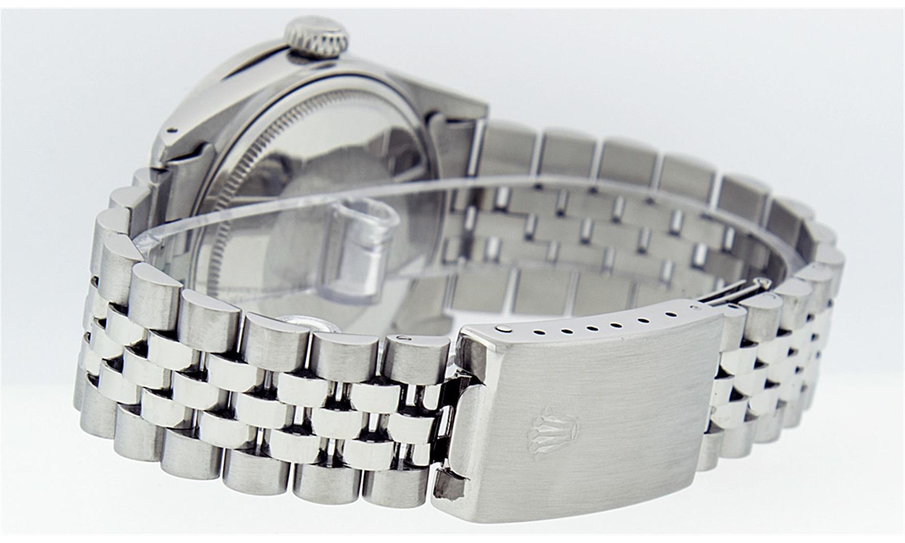 One Mens Rolex Datejust Polished Bright with Satin Finish, Serviced & Electronically Tested, Stainless Steel Case:36mm, Stainless Steel Crown, Custom Bezel: Stainless Steel Beadset Diamond Bezel, Diamond Count: 54 Diamonds Total Weight .90 Carat, Clarity: SI-VS, Color: G to H. Custom Crystal: Synthetic Sapphire Cyclops Lens. Movement: Automatic Winding Movement Caliber 3035. Custom Dial: Black Diamond 8 + 2, Diamond Count: 8 Diamonds + 2 Baguettes, Diamond Color: G to H, VS2 Si1. Date Window: 3 O'Clock Position Date Display, Quickset, Model: Datejust. Condition: G-6 Extra Fine. Bracelet:Stainless Steel Jubilee. Bright Polish & Satin Finish. 7.0 Inch Length, Adjustable. Standard Clasp, With Rolex Logo.