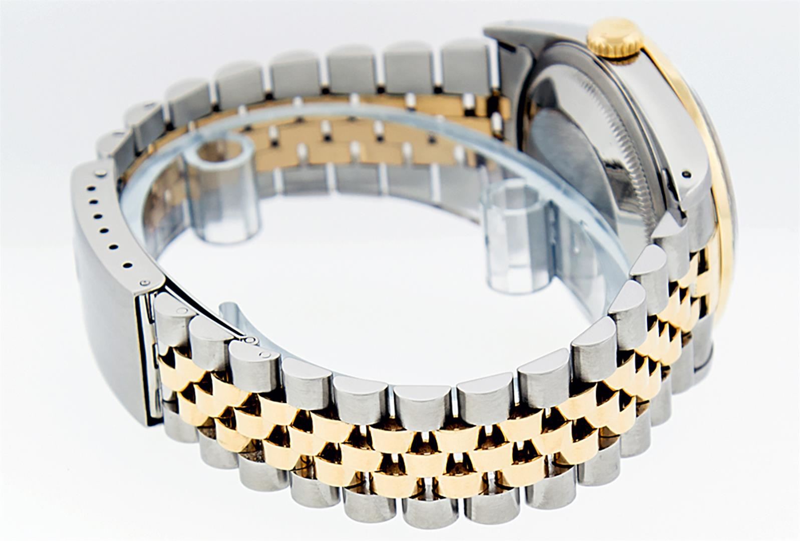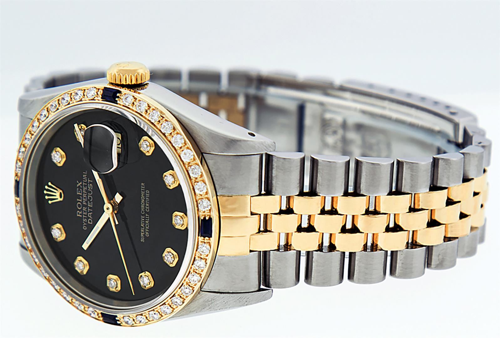 One Mens 14K Yellow Gold Two Tone Rolex Datejust Polished, Serviced & Electronically Tested, 14K Yellow Gold & Stainless Steel Case: 36mm, 14K Yellow Gold Crown, Custom Bezel: New 18K Yellow Gold Beadset + Sapphire Diamond Bezel, Stone Count: 36 Diamonds + 4 Sapphires On The Bezel, Total Weight 1.00 Carat, Clarity: SI-VS, Color: G to H. Custom Crystal: New Scratch Resistant Synthetic Sapphire Cyclops Lens. Custom Hands: New Luminecent Hands. Movement: Automatic Winding Movement Caliber 3035. Custom Dial: Black With Single Cut Diamond Hour Markers. Diamond Count: 10 Diamonds In Dial, Clarity: VS, Color: Color G to H Date Window: 3 O'Clock Position Date Display, Quickset, Model: Datejust. Condition: G-6 Extra Fine. Bracelet: Two Tone 14K Yellow Gold & Stainless Steel Jubilee Band. Bright Polish. 7.0 Inch Length, Adjustable. Standard Clasp, With Rolex Logo. This Watch Has Been Serviced Time Tested And Is In Excellent Condition It Is Free Of All Scratches And Dents.
