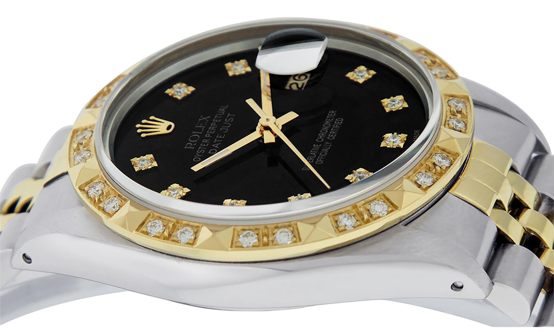 One Mens 14K Yellow Gold Rolex Datejust Polished Bright with Satin Finish, Serviced & Electronically Tested, Stainless Steel Case: 36mm, Yellow Gold Crown, Custom Bezel: New 18K Yellow Gold Pyramid Diamond Bezel, Diamond Count: 24 Diamonds, Total Weight .75 Carat, Clarity: SI-VS, Color: G to H. Custom Crystal: New Scratch Resistant Synthetic Sapphire Cyclops Lens. Custom Hands: New Luminecent Hands. Movement: Automatic Winding Movement Caliber 3035. Custom Dial: Black Single Cut Diamond Dial, Diamond Count: 10 Diamonds In Dial, Color: G to H, Clarity: VS. Date Window: 3 O'Clock Position Date Display, Quickset, Model: Datejust. Condition: G-6 Extra Fine. Bracelet: 14K Yellow Gold And Stainless Steel Jubilee Band. Bright Polish & Satin Finish. 7.0 Inch Length, Adjustable. Standard Clasp, With Rolex Logo. This Watch Has Been Serviced And Polished It Is Free Of All Scratches And Dents.