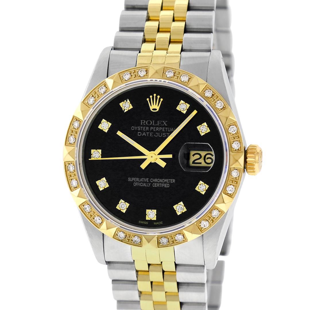 One Mens 14K Yellow Gold Rolex Datejust Polished Bright with Satin Finish, Serviced & Electronically Tested, Stainless Steel Case: 36mm, Yellow Gold Crown, Custom Bezel: New 18K Yellow Gold Pyramid Diamond Bezel, Diamond Count: 24 Diamonds, Total Weight .75 Carat, Clarity: SI-VS, Color: G to H. Custom Crystal: New Scratch Resistant Synthetic Sapphire Cyclops Lens. Custom Hands: New Luminecent Hands. Movement: Automatic Winding Movement Caliber 3035. Custom Dial: Black Single Cut Diamond Dial, Diamond Count: 10 Diamonds In Dial, Color: G to H, Clarity: VS. Date Window: 3 O'Clock Position Date Display, Quickset, Model: Datejust. Condition: G-6 Extra Fine. Bracelet: 14K Yellow Gold And Stainless Steel Jubilee Band. Bright Polish & Satin Finish. 7.0 Inch Length, Adjustable. Standard Clasp, With Rolex Logo. This Watch Has Been Serviced And Polished It Is Free Of All Scratches And Dents.