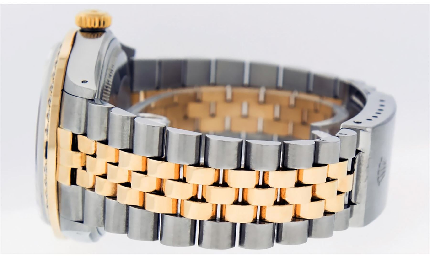 One Mens 14K Yellow Gold Two Tone Rolex Datejust Polished, Serviced & Electronically Tested, 14K Yellow Gold & Stainless Steel Case: 36mm, 14K Yellow Gold Crown, Custom Bezel: New 18K Yellow Gold Sapphire Beadset Diamond Bezel, Diamond Count: 36 Diamonds + 4 Sapphires, Total Weight 1.00 Carat, Clarity: SI-VS, Color: G to H. Custom Crystal: New Scratch Resistant Synthetic Sapphire Cyclops Lens. Movement: Automatic Winding Movement Caliber 3035. Custom Dial: Black Dial With Diamond Hour Markers and Synthetic Sapphire Baguette Markers On 6 and 9, Stone Count: 8 Diamonds + 2 Synthetic Bagguette Sapphires In Dial. Date Window: 3 O'Clock Position Date Display, Quickset, Model: Datejust, Condition: G-6 Extra Fine. Bracelet: Two Tone 14K Yellow Gold & Stainless Steel Jubilee Band. Bright Polish. 7.0 Inch Length, Adjustable. Standard Clasp, With Rolex Logo. This Watch Has Been Serviced Time Tested And Is In Excellent Condition It Is Free Of All Scratches And Dents.