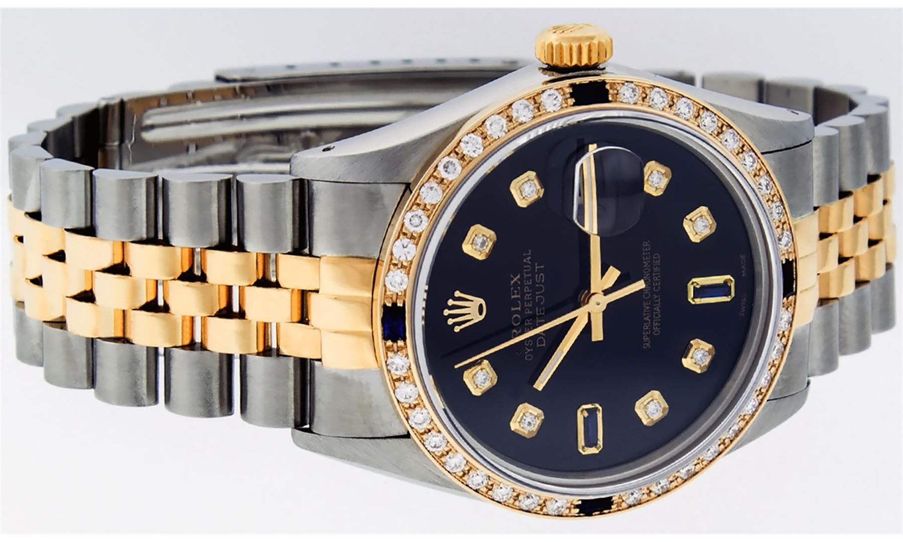 One Mens 14K Yellow Gold Two Tone Rolex Datejust Polished, Serviced & Electronically Tested, 14K Yellow Gold & Stainless Steel Case: 36mm, 14K Yellow Gold Crown, Custom Bezel: New 18K Yellow Gold Sapphire Beadset Diamond Bezel, Diamond Count: 36 Diamonds + 4 Sapphires, Total Weight 1.00 Carat, Clarity: SI-VS, Color: G to H. Custom Crystal: New Scratch Resistant Synthetic Sapphire Cyclops Lens. Movement: Automatic Winding Movement Caliber 3035. Custom Dial: Black Dial With Diamond Hour Markers and Synthetic Sapphire Baguette Markers On 6 and 9, Stone Count: 8 Diamonds + 2 Synthetic Bagguette Sapphires In Dial. Date Window: 3 O'Clock Position Date Display, Quickset, Model: Datejust, Condition: G-6 Extra Fine. Bracelet: Two Tone 14K Yellow Gold & Stainless Steel Jubilee Band. Bright Polish. 7.0 Inch Length, Adjustable. Standard Clasp, With Rolex Logo. This Watch Has Been Serviced Time Tested And Is In Excellent Condition It Is Free Of All Scratches And Dents.