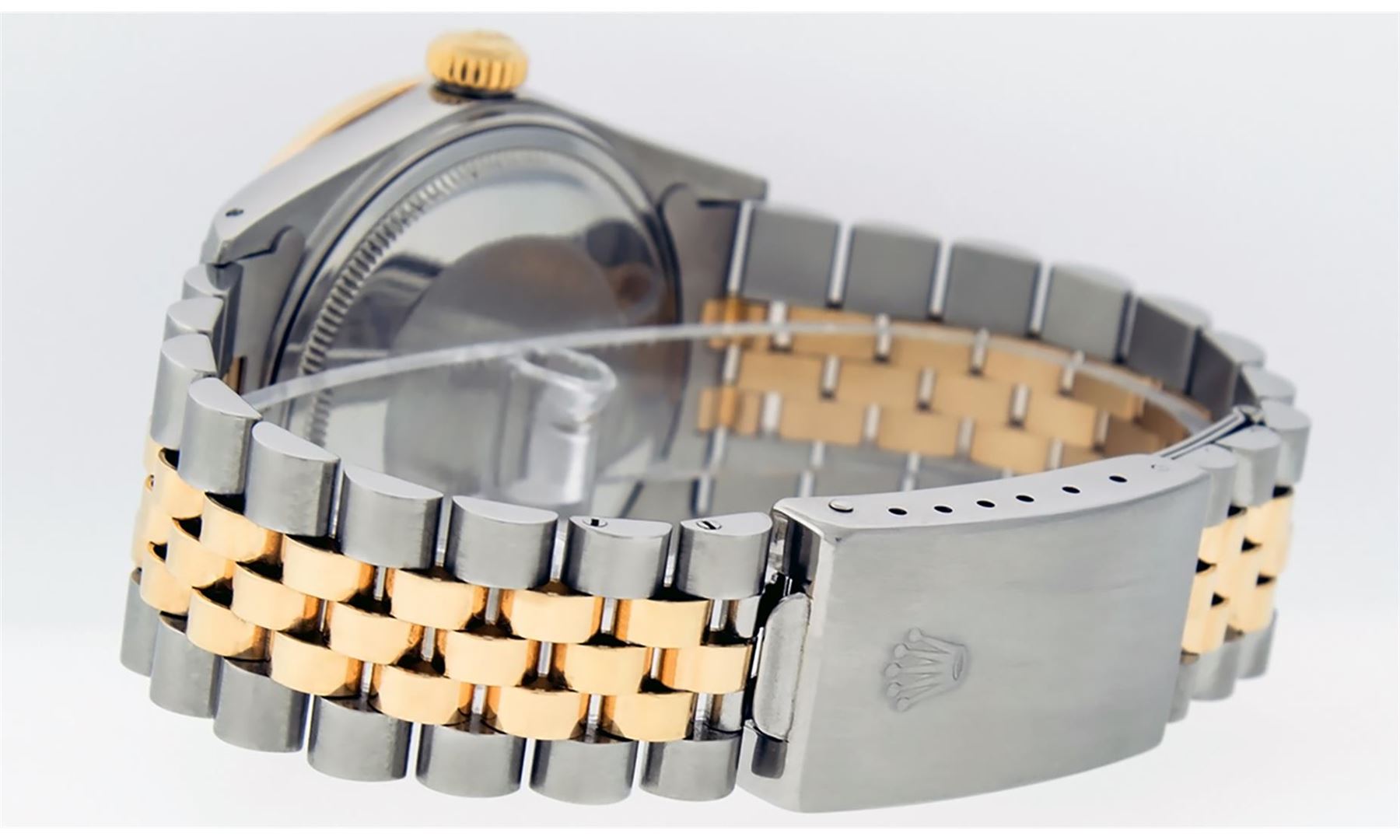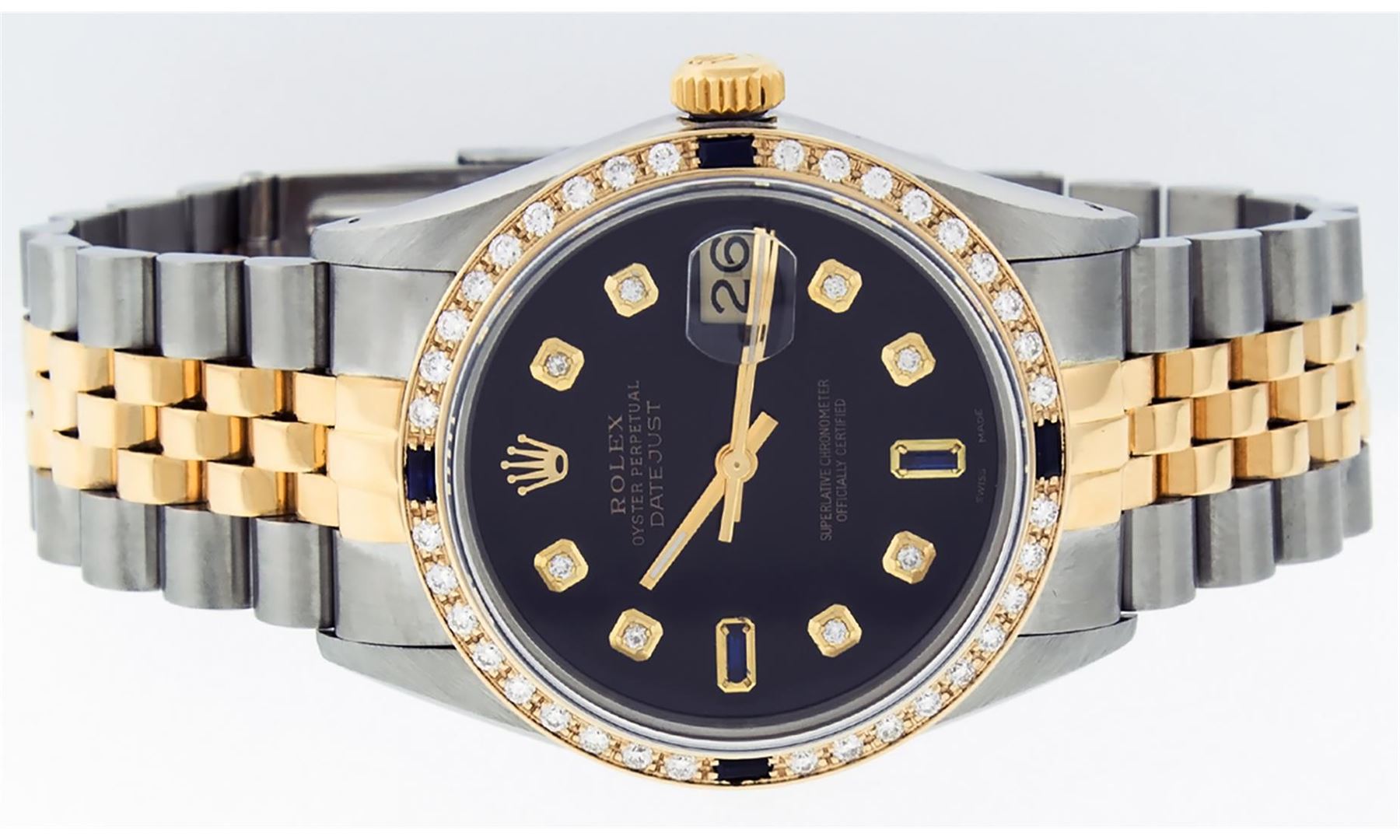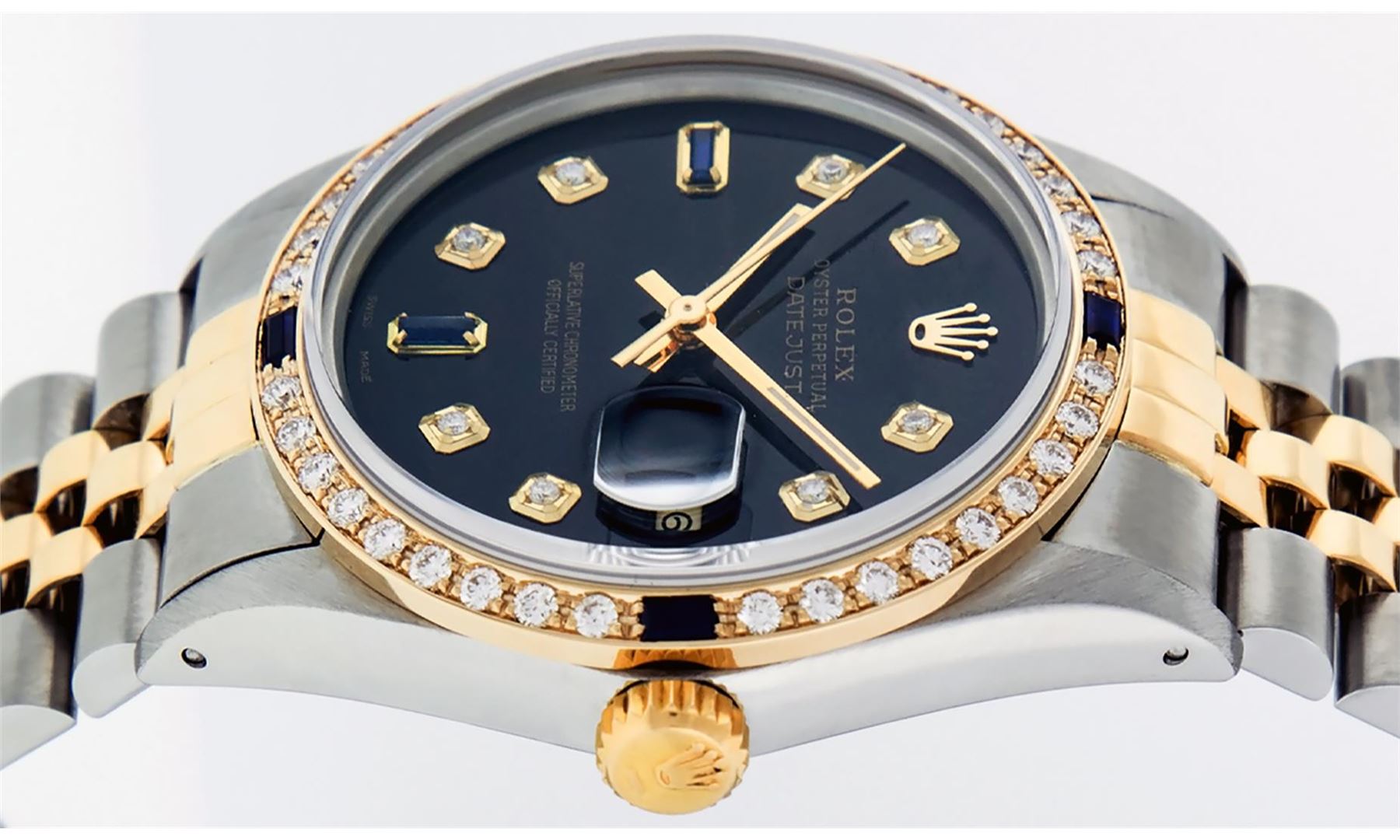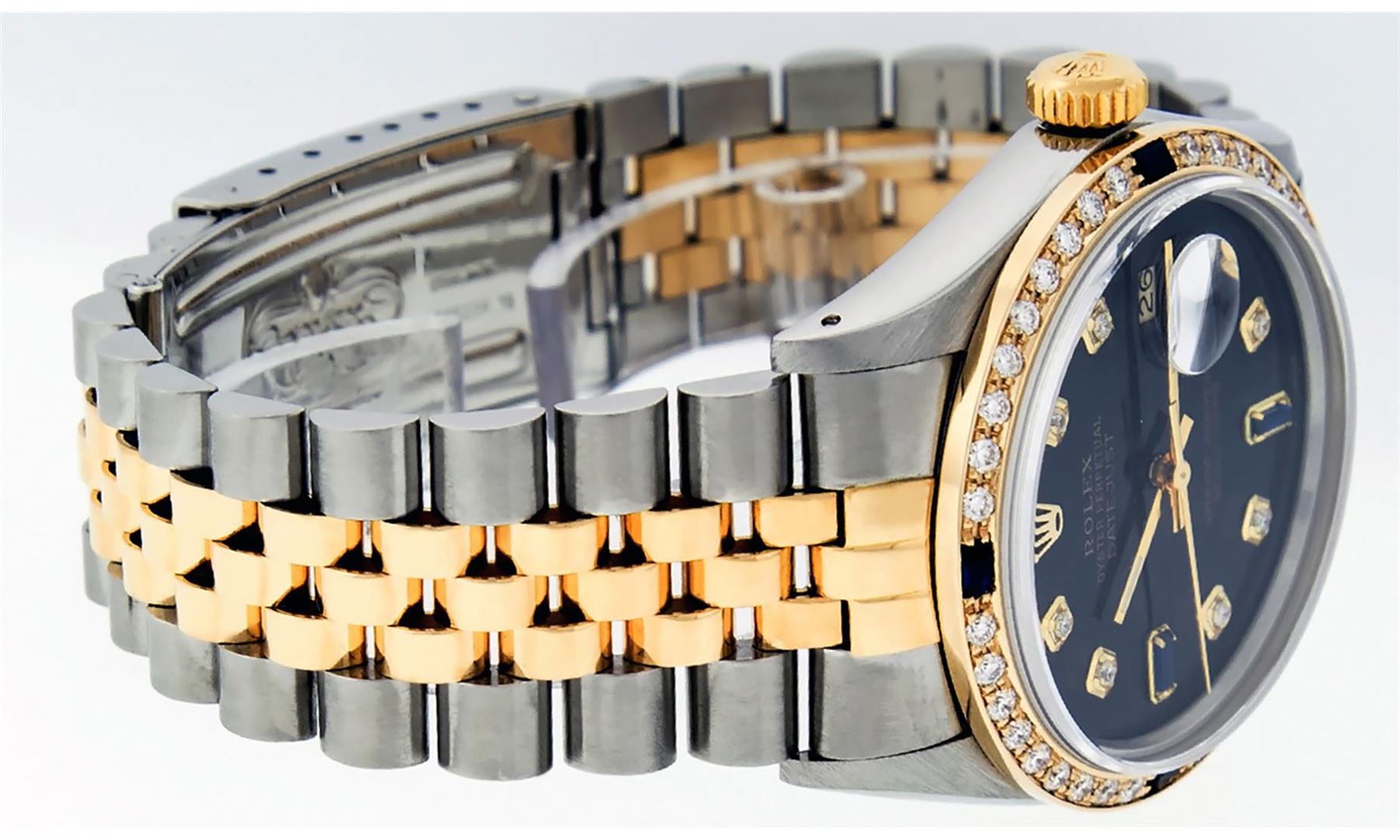 One Mens 14K Yellow Gold Two Tone Rolex Datejust Polished, Serviced & Electronically Tested, 14K Yellow Gold & Stainless Steel Case: 36mm, 14K Yellow Gold Crown, Custom Bezel: New 18K Yellow Gold Sapphire Beadset Diamond Bezel, Diamond Count: 36 Diamonds + 4 Sapphires, Total Weight 1.00 Carat, Clarity: SI-VS, Color: G to H. Custom Crystal: New Scratch Resistant Synthetic Sapphire Cyclops Lens. Movement: Automatic Winding Movement Caliber 3035. Custom Dial: Black Dial With Diamond Hour Markers and Synthetic Sapphire Baguette Markers On 6 and 9, Stone Count: 8 Diamonds + 2 Synthetic Bagguette Sapphires In Dial. Date Window: 3 O'Clock Position Date Display, Quickset, Model: Datejust, Condition: G-6 Extra Fine. Bracelet: Two Tone 14K Yellow Gold & Stainless Steel Jubilee Band. Bright Polish. 7.0 Inch Length, Adjustable. Standard Clasp, With Rolex Logo. This Watch Has Been Serviced Time Tested And Is In Excellent Condition It Is Free Of All Scratches And Dents.