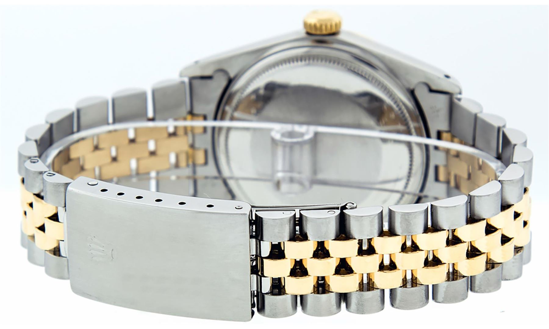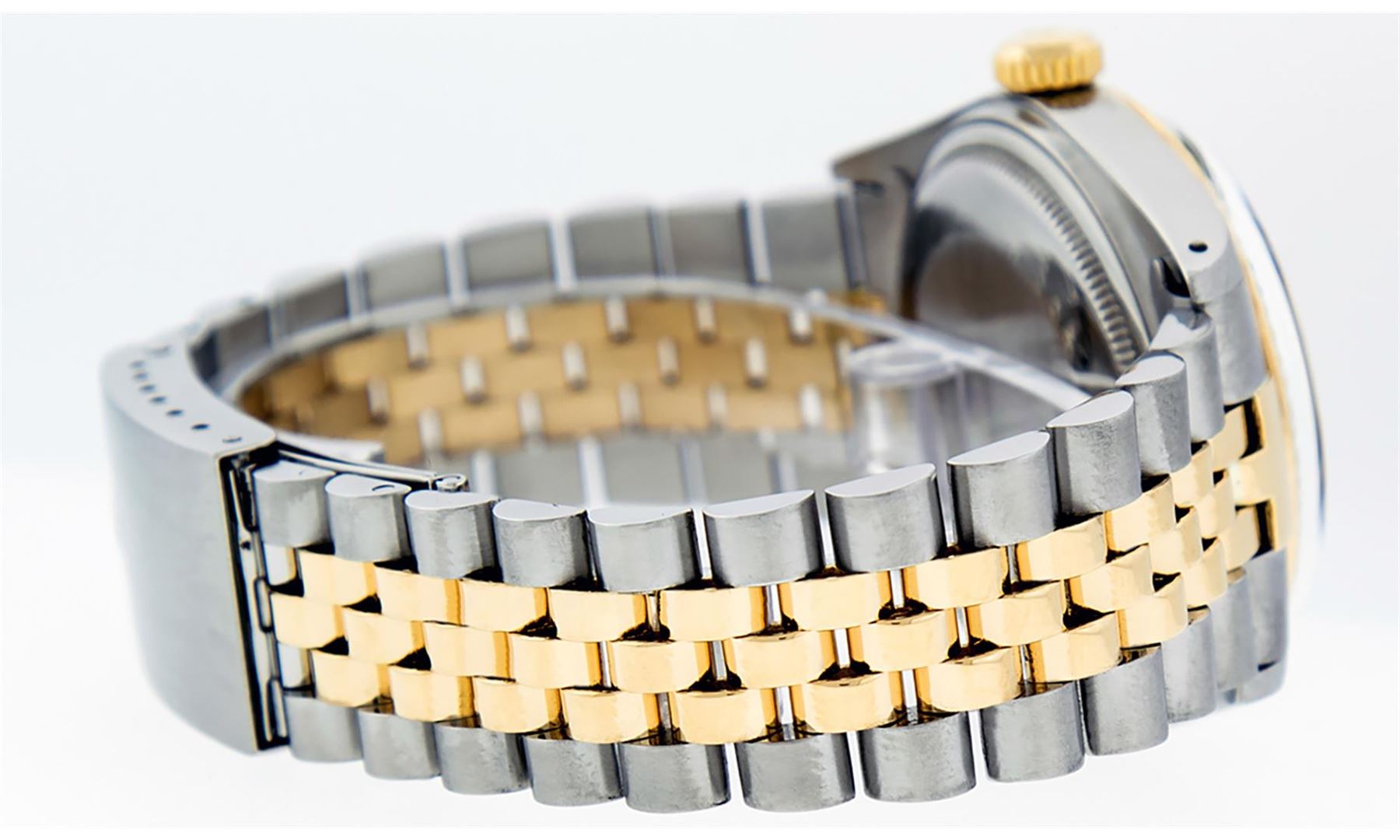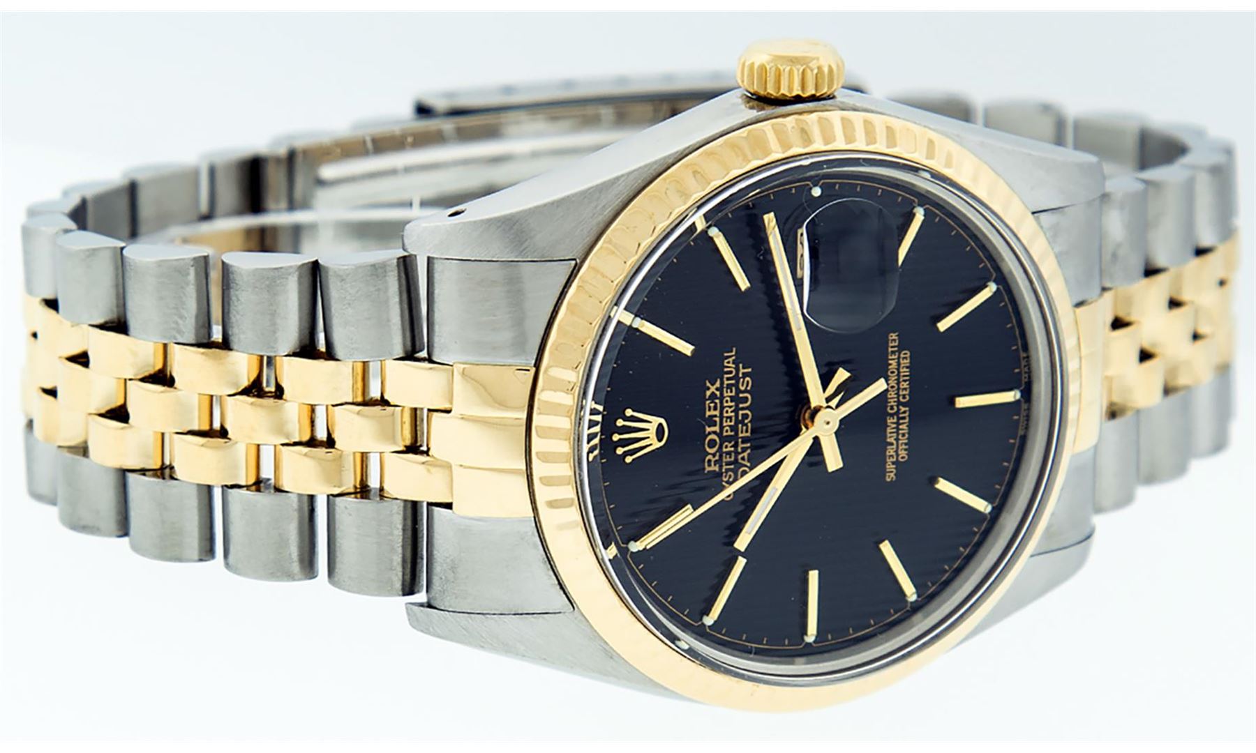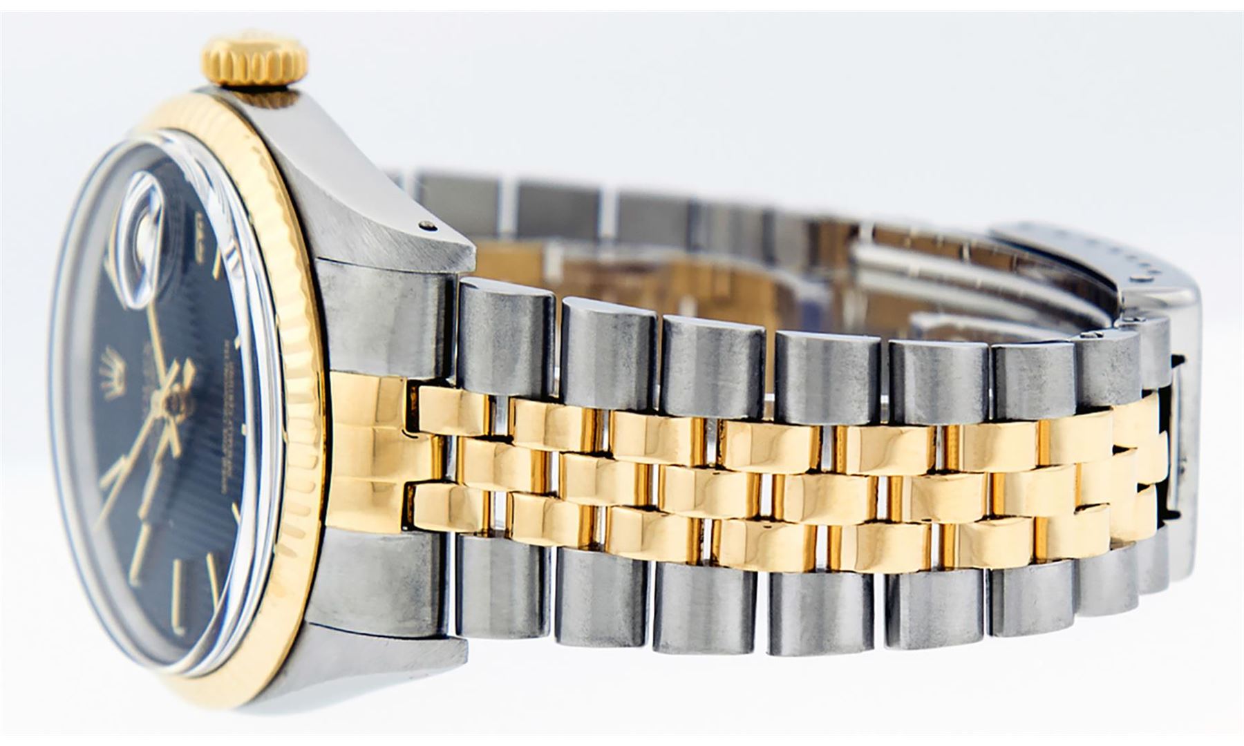 One Men's 14K Yellow Gold Two Tone Rolex Datejust Polished, Serviced & Electronically Tested, 14K Yellow Gold & Stainless Steel Case: 36mm,14K Yellow Gold Crown, Bezel: 14K Yellow Gold Fluted Bezel. Custom Crystal: New Acrylic Cyclops Lens. Custom Hands: New Luminescent Hands. Movement: Automatic Winding Movement Caliber 3035. Dial: Black Tapestry Dial With Index Hour Markers and Small Track With Lumi Dots. Date Window: 3 O'Clock Position Date Display, Quickset, Model: Datejust. Condition: G-6 Extra Fine. Bracelet: Two Tone 14K Yellow Gold & Stainless Steel Jubilee Band. Bright Polish. 7.0 Inch Length, Adjustable. Standard Clasp, With Rolex Logo. This Watch Has Been Serviced Time Tested And Is In Excellent Condition It Is Free Of All Scratches And Dents.