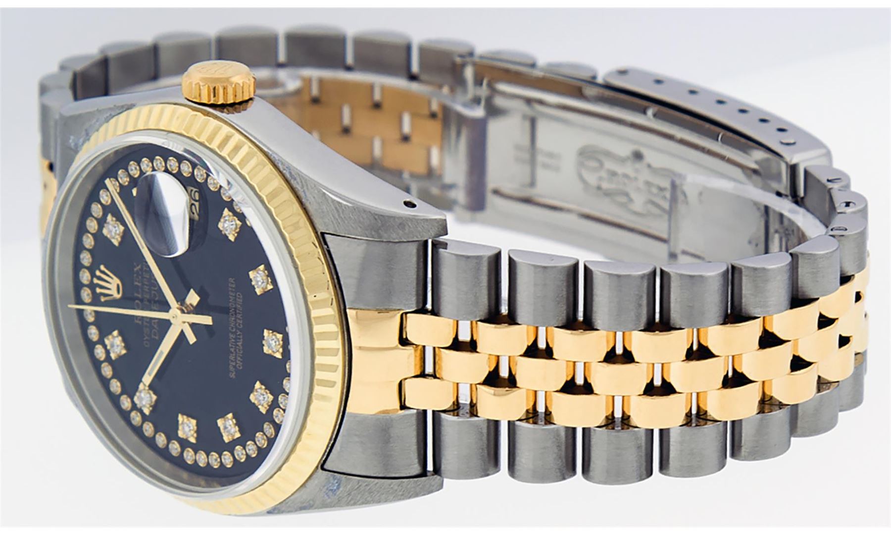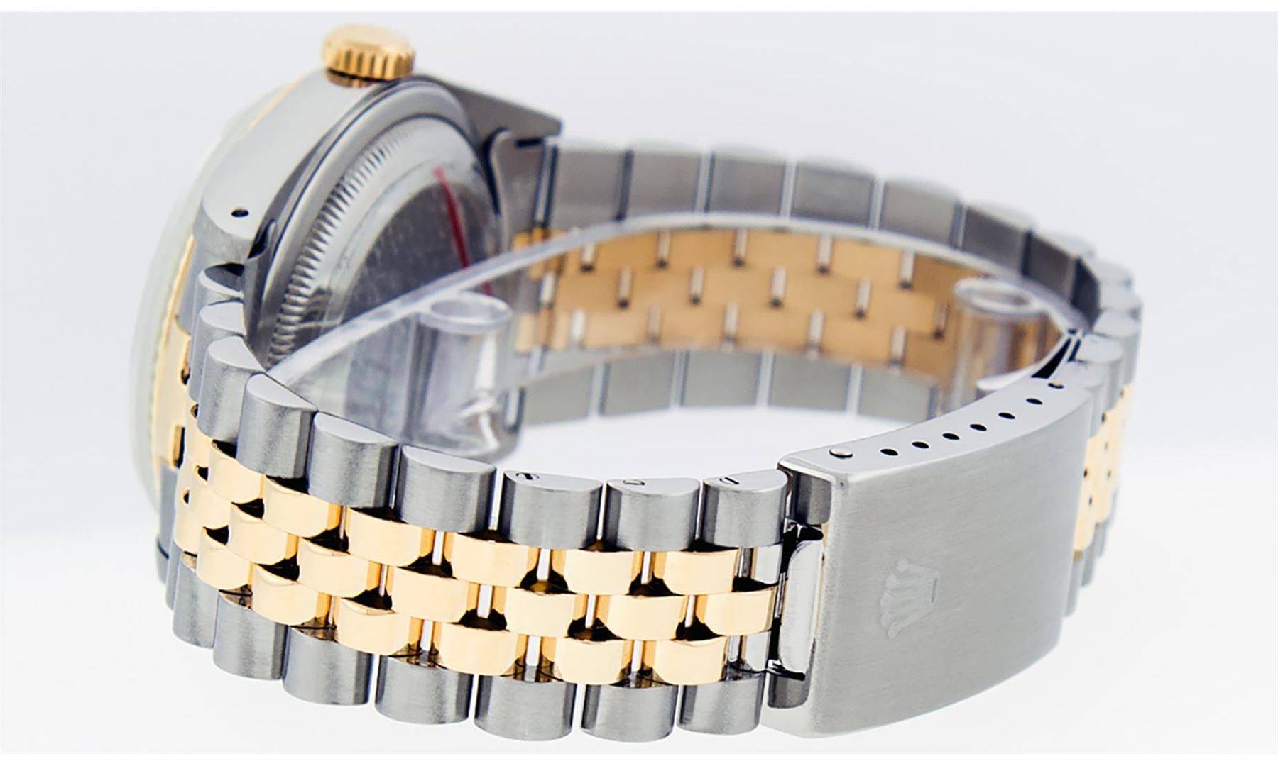 One Mens 14K Yellow Gold Two Tone Rolex Datejust Polished, Serviced & Electronically Tested, 14K Yellow Gold & Stainless Steel Case: 36mm, 14K Yellow Gold Crown, Bezel: 14K Yellow Gold Fluted Bezel. Custom Crystal: New Acrylic Cyclops Lens. Custom Hands: New Luminecent Hands. Movement: Automatic Winding Movement Caliber 3035. Custom Dial: Black Single Cut String Dial Set With VS Diamond Hour Markers, Diamond Count: 58 Diamonds in Dial, G To H In Color, SI-VS Clarity. Date Window: 3 O'Clock Position Date Display, Quickset, Model: 16013 Datejust, Condition: G-6 Extra Fine. Bracelet: Two Tone 14K Yellow Gold & Stainless Steel Jubilee Band. Bright Polish. 7.0 Inch Length, Adjustable. Standard Clasp, With Rolex Logo. This Watch Has Been Serviced And Polished It Is Free Of All Scratches And Dents.
