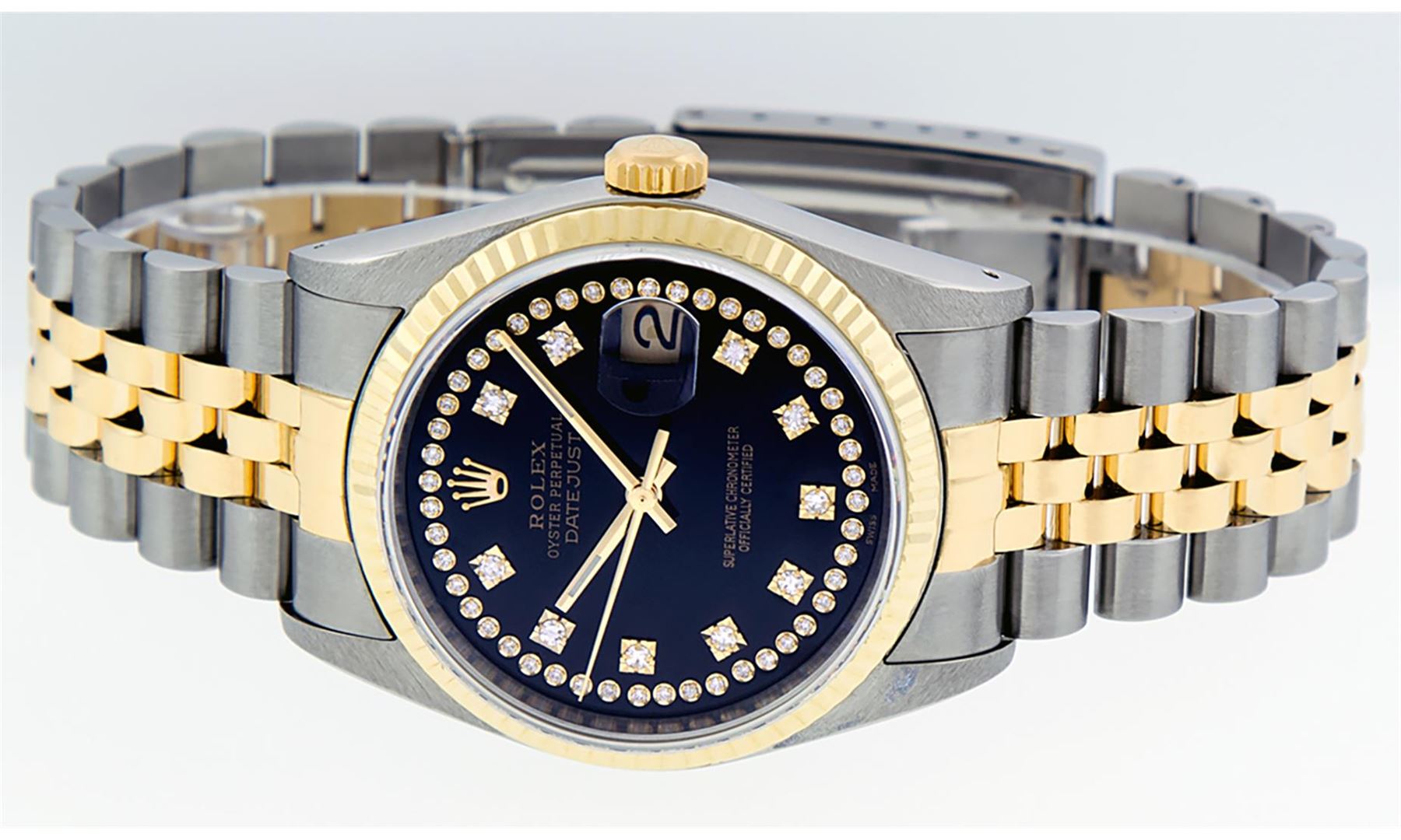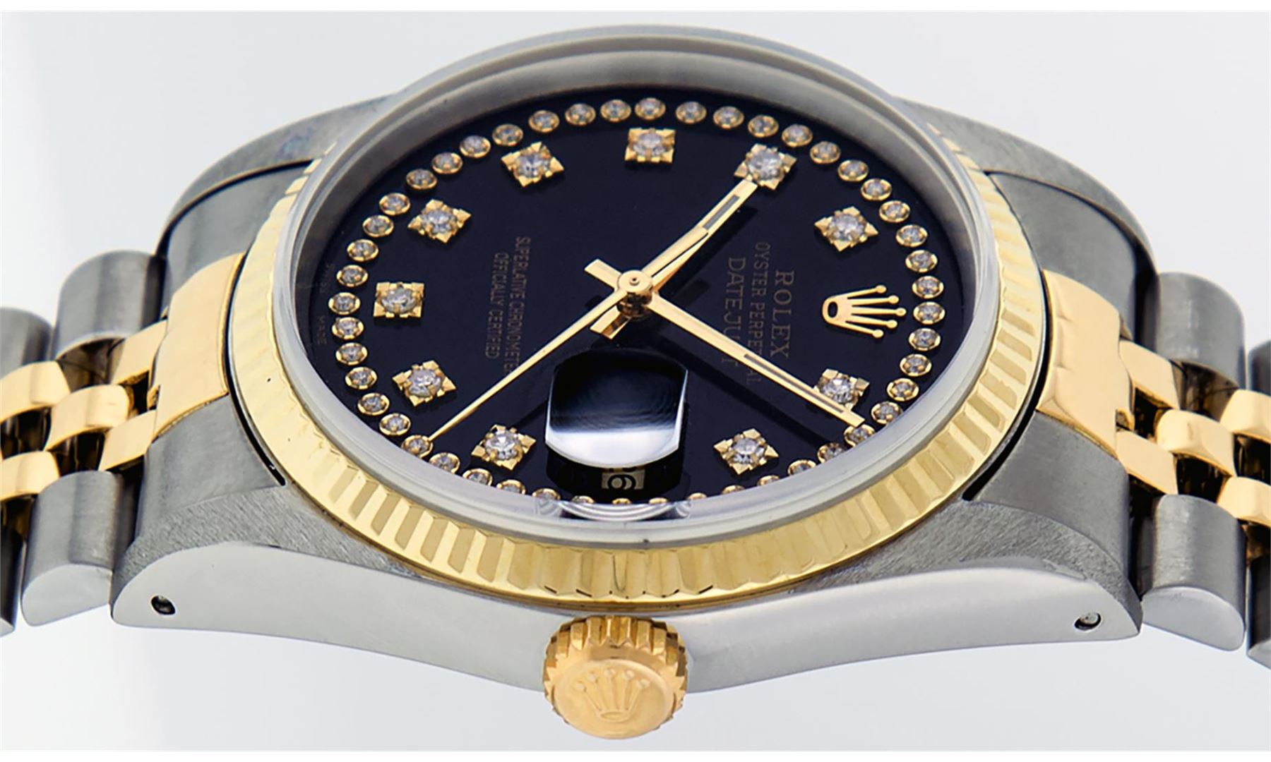 One Mens 14K Yellow Gold Two Tone Rolex Datejust Polished, Serviced & Electronically Tested, 14K Yellow Gold & Stainless Steel Case: 36mm, 14K Yellow Gold Crown,�Bezel: 14K Yellow Gold�Fluted Bezel. Custom Crystal: New Acrylic Cyclops Lens. Custom Hands: New Luminecent Hands. Movement: Automatic Winding Movement Caliber 3035. Custom Dial: Black Single Cut String Dial Set With VS Diamond Hour Markers,�Diamond Count: 58 Diamonds�in Dial, G To H In Color, SI-VS Clarity. Date Window: 3 O'Clock Position Date Display,�Quickset, Model: 16013 Datejust, Condition: G-6 Extra Fine. Bracelet: Two Tone 14K Yellow Gold & Stainless Steel Jubilee Band. Bright Polish.�7.0 Inch Length, Adjustable. Standard Clasp, With Rolex Logo. This Watch Has Been Serviced And Polished It Is Free Of All Scratches And Dents.