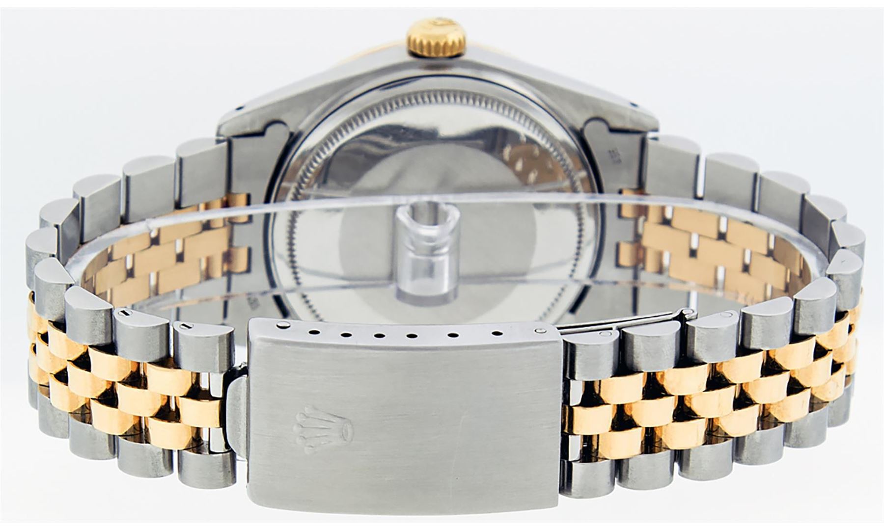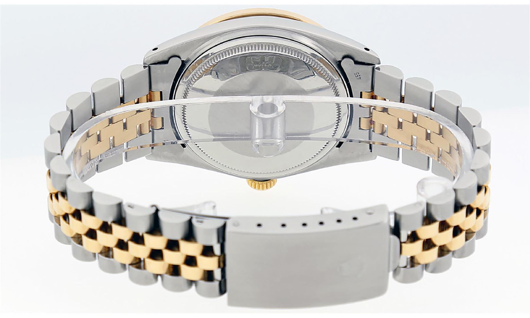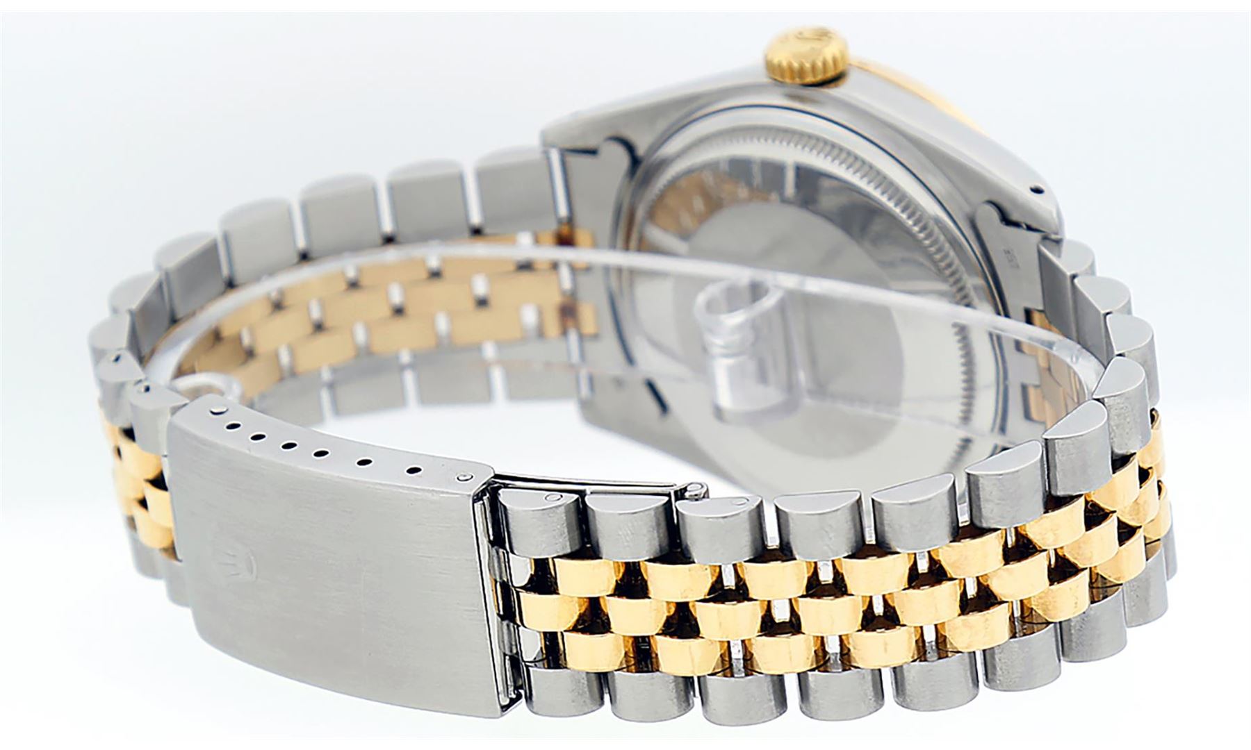 One Mens 14K Yellow Gold Two Tone Rolex Datejust Polished, Serviced & Electronically Tested, 14K Yellow Gold & Stainless Steel Case: 36mm, 14K Yellow Gold Crown, Custom Bezel: New 18K Yellow Gold Beadset Diamond Bezel, Diamond Count: 44 Diamonds, Total Weight 1.00 Carat, Clarity: SI-VS, Color: G to H. Custom Crystal: New Scratch Resistant Synthetic Sapphire Cyclops Lens. Movement: Automatic Winding Movement Caliber 3035. Custom Dial: Blue Diamond Dial with 9 & 6 Diamond Hour Markers, Diamond Count: 8 Diamonds + 28 Diamonds On 6 & 9 Hour Markers, Color: G To H In Color, Clarity: SI-VS, Date Window: 3 O'Clock Position Date Display, Quickset, Model: 16013 Datejust. Condition: G-6 Extra Fine. Bracelet: Two Tone 14K Yellow Gold & Stainless Steel Jubilee. Bright Polish. 7.0 Inch Length, Adjustable. Standard Clasp, With Rolex Logo. This Watch Has Been Serviced Time Tested And Is In Excellent Condition It Is Free Of All Scratches And Dents.