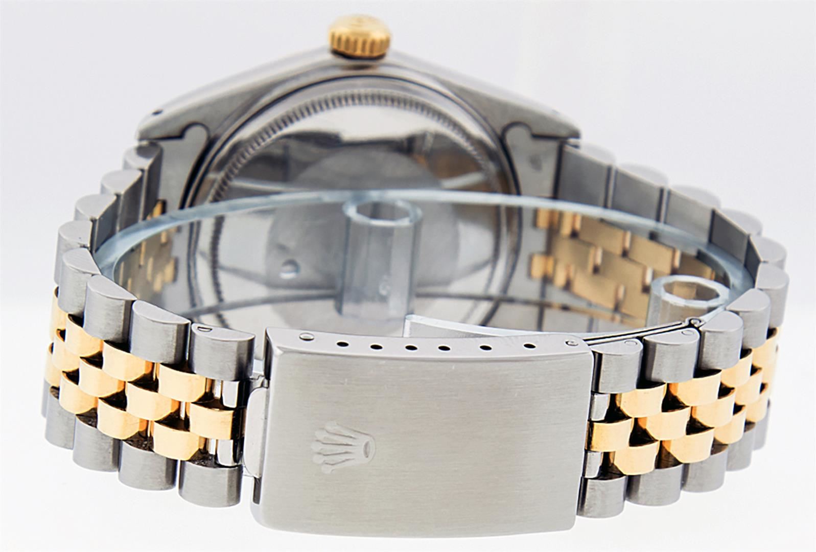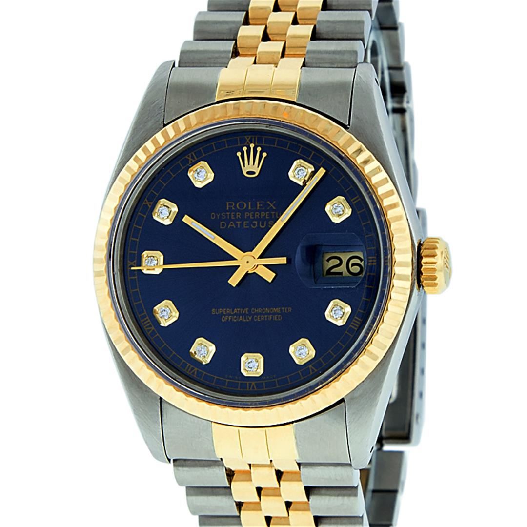 One Mens 14K Yellow Gold Two Tone Rolex Datejust Polished, Serviced & Electronically Tested, 14K Yellow Gold & Stainless Steel Case: 36mm, 14K Yellow Gold Crown, Bezel: 14K Yellow Gold Fluted Bezel. Custom Crystal: New Acrylic Cyclops Lens. Custom Hands: New Luminecent Hands. Movement: Automatic Winding Movement Caliber 3035. Custom Dial: Blue With Diamond Hour Markers And Square Roman Track, Diamond Count: 10 Diamonds in Dial, G To H In Color, SI-VS Clarity. Date Window: 3 O'Clock Position Date Display, Quickset, Model: 16013 Datejust, Condition: G-6 Extra Fine. Bracelet: Two Tone 14K Yellow Gold & Stainless Steel Jubilee. Bright Polish. 7.0 Inch Length, Adjustable. Standard Clasp, With Rolex Logo. This Watch Has Been Serviced And Polished It Is Free Of All Scratches And Dents.