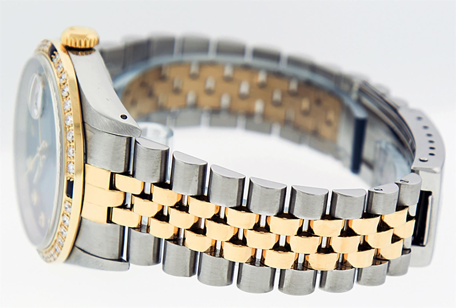 One Mens 14K Yellow Gold Two Tone Rolex Datejust Polished, Serviced & Electronically Tested, 14K Yellow Gold & Stainless Steel Case: 36mm, 14K Yellow Gold Crown, Custom Bezel: New 18K Yellow Gold Sapphire Beadset Diamond Bezel, Diamond Count:�36 Diamonds + 4 Sapphires�Total Weight 1.00 Carat, Clarity: SI-VS, Color: G to H. Custom Crystal: New Scratch Resistant Synthetic Sapphire Cyclops Lens. Custom Hands: New Luminecent Hands. Movement: Automatic Winding Movement Caliber 3035. Custom Dial: Blue Vignette With Diamond Hour Markers & Dash Track. Diamond Count: 10 Diamonds, Clarity: VS, Color: G to H Date Window: 3 O'Clock Position Date Display,�Quickset, Model: Datejust, Condition: G-6 Extra Fine. Bracelet: Two Tone 14K Yellow Gold & Stainless Steel Jubilee. Bright Polish. 7.0 Inch Length, Adjustable. Standard Clasp, With Rolex Logo. This Watch Has Been Serviced Time Tested And Is In Excellent Condition It Is Free Of All Scratches And Dents.