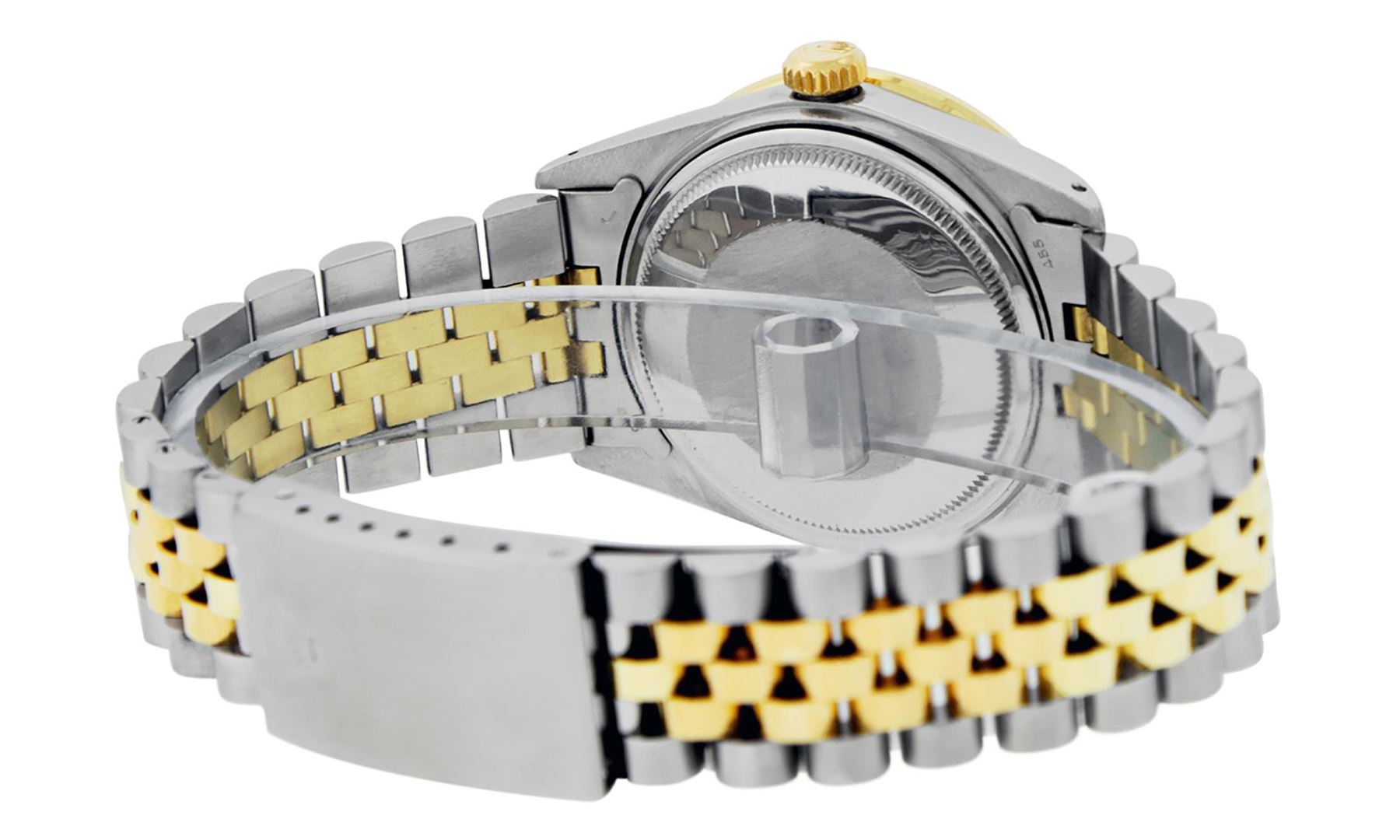 One Mens 14K Yellow Gold Rolex Datejust Polished Bright with Satin Finish, Serviced & Electronically Tested, Stainless Steel Case: 36mm, Yellow Gold Crown, Custom Bezel: New 18K Yellow Gold Pyramid Diamond Bezel, Diamond Count: 24 Diamonds In Bezel, Total Weight .75 Carat, Clarity: SI-VS, Color: G to H. Custom Crystal: New Scratch Resistant Synthetic Sapphire Cyclops Lens. Custom Hands: New Luminecent Hands. Movement: Automatic Winding Movement Caliber 3035. Custom Dial: Blue Vignette Single Cut Diamond Dial, Diamond Count: 10 Diamonds In Dial, Color: G to H, Clarity: VS. Date Window: 3 O'Clock Position Date Display, Quickset, Model: Datejust. Condition: G-6 Extra Fine. Bracelet: 14K Yellow Gold And Stainless Steel Jubilee Band. Bright Polish & Satin Finish. 7.0 Inch Length, Adjustable. Standard Clasp, With Rolex Logo. This Watch Has Been Serviced And Polished It Is Free Of All Scratches And Dents.
