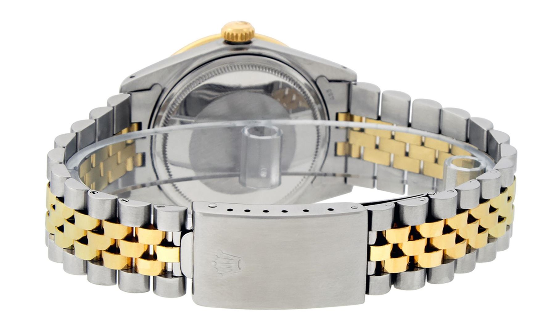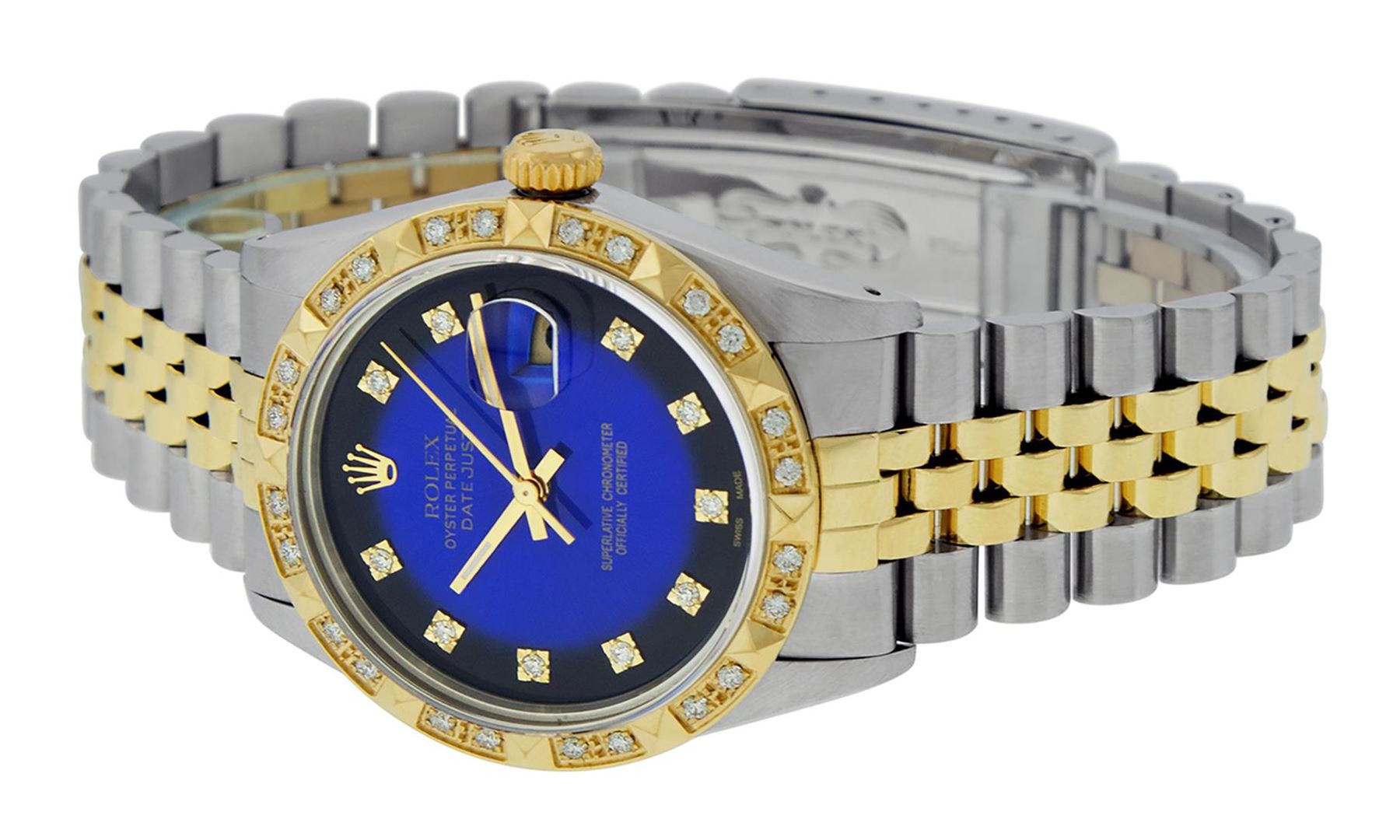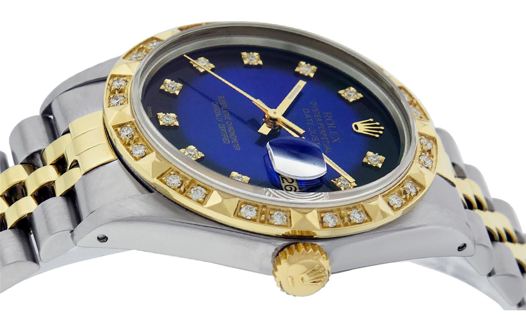 One Mens 14K Yellow Gold Rolex Datejust Polished Bright with Satin Finish, Serviced & Electronically Tested, Stainless Steel Case: 36mm, Yellow Gold Crown, Custom Bezel: New 18K Yellow Gold Pyramid Diamond Bezel, Diamond Count: 24 Diamonds In Bezel, Total Weight .75 Carat, Clarity: SI-VS, Color: G to H. Custom Crystal: New Scratch Resistant Synthetic Sapphire Cyclops Lens. Custom Hands: New Luminecent Hands. Movement: Automatic Winding Movement Caliber 3035. Custom Dial: Blue Vignette Single Cut Diamond Dial, Diamond Count: 10 Diamonds In Dial, Color: G to H, Clarity: VS. Date Window: 3 O'Clock Position Date Display, Quickset, Model: Datejust. Condition: G-6 Extra Fine. Bracelet: 14K Yellow Gold And Stainless Steel Jubilee Band. Bright Polish & Satin Finish. 7.0 Inch Length, Adjustable. Standard Clasp, With Rolex Logo. This Watch Has Been Serviced And Polished It Is Free Of All Scratches And Dents.