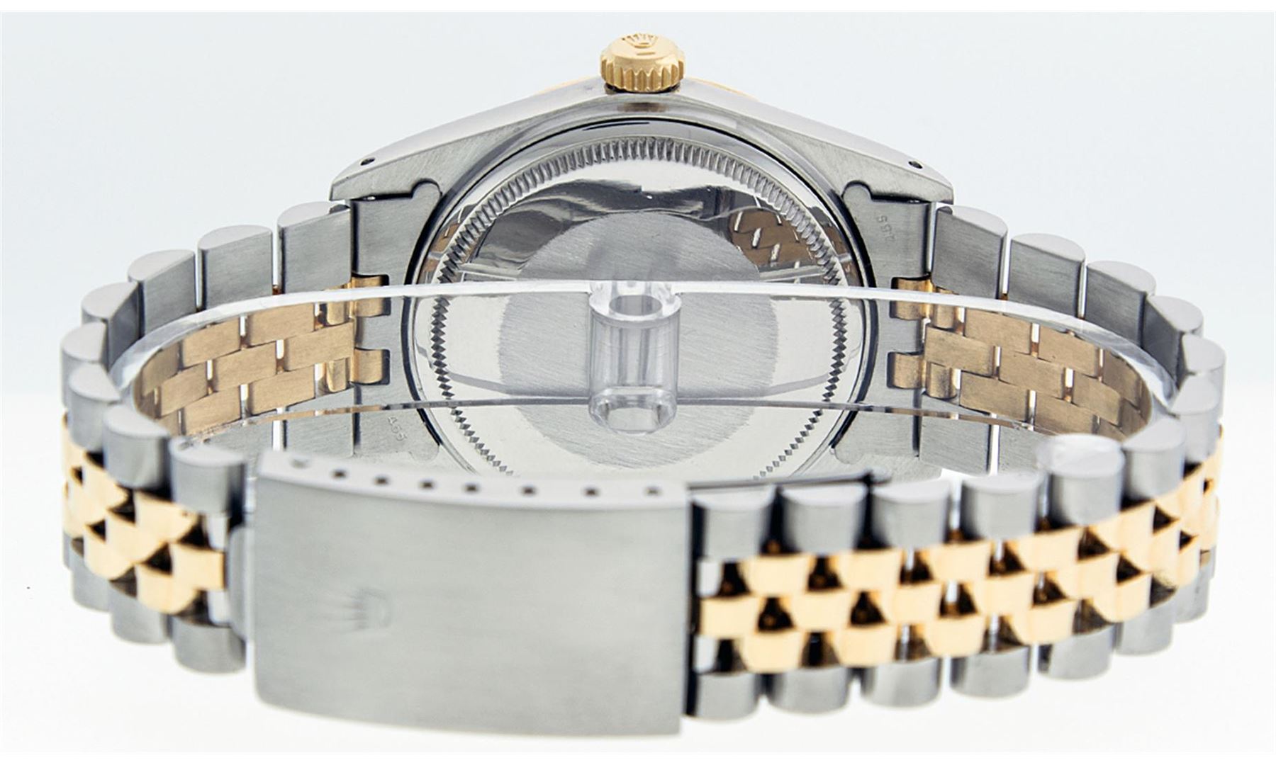 One Mens 14K Yellow Gold Two Tone Rolex Datejust Polished, Serviced & Electronically Tested, 14K Yellow Gold & Stainless Steel Case: 36mm, 14K Yellow Gold Crown, Bezel: 14K Yellow Gold Fluted Bezel. Custom Crystal: New Acrylic Cyclops Lens. Custom Hands: New Luminecent Hands. Movement: Automatic Winding Movement Caliber 3035. Custom Dial: Champagne Diamond Dial, Diamond Count: 8 Diamonds + 2 Baguette Diamonds in Dial, G To H In Color, SI-VS Clarity. Date Window: 3 O'Clock Position Date Display, Quickset, Model: Datejust, Condition: G-6 Extra Fine. Bracelet: Two Tone 14K Yellow Gold & Stainless Steel Jubilee Band. Bright Polish. 7.0 Inch Length, Adjustable. Standard Clasp, With Rolex Logo. This Watch Has Been Serviced And Polished It Is Free Of All Scratches And Dents.