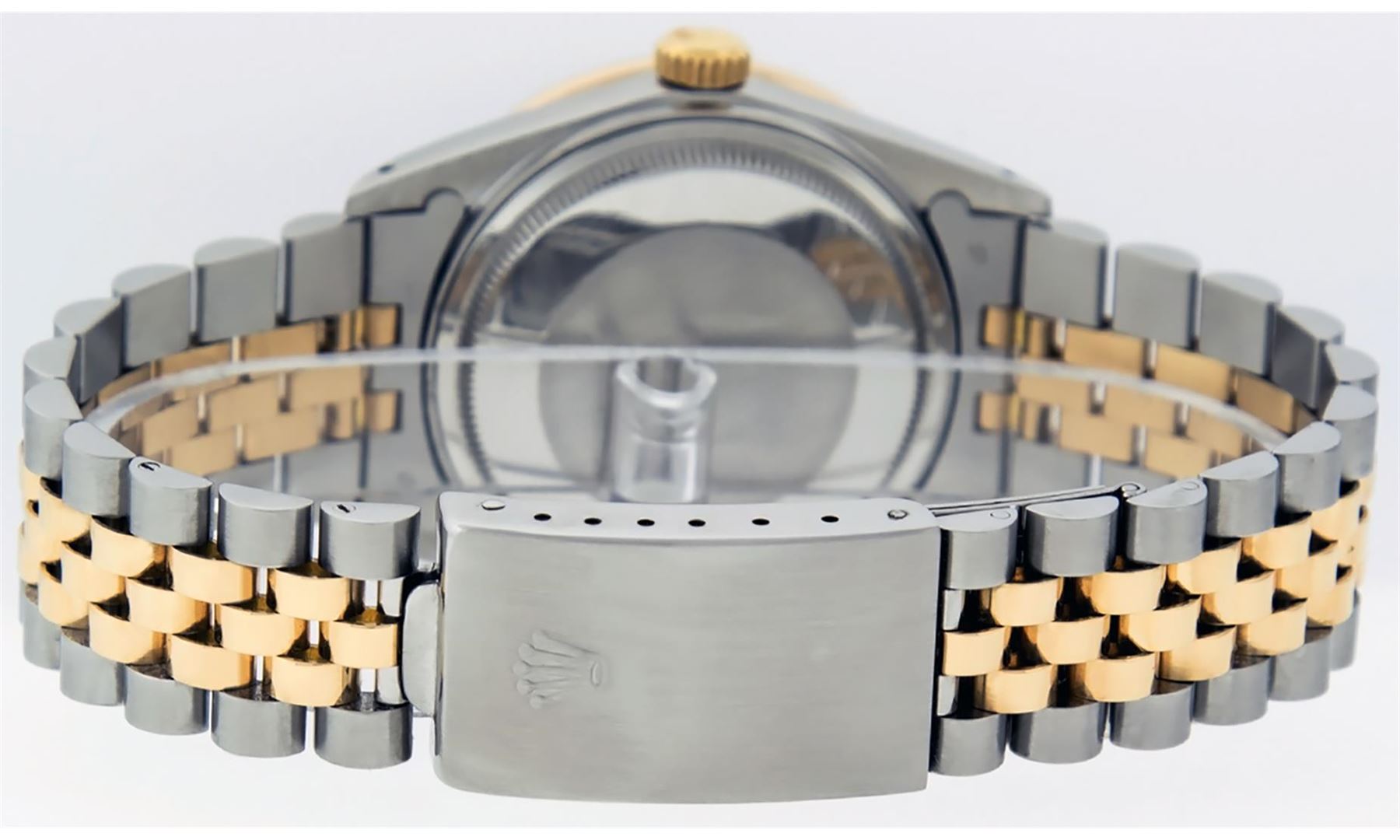One Mens 14K Yellow Gold Rolex Datejust Polished Bright with Satin Finish, Serviced & Electronically Tested, Stainless Steel Case: 36mm, Yellow Gold Crown, Custom Bezel: New 18K Yellow Gold Pyramid Diamond Bezel, Diamond Count: 24 Diamonds, Total Weight .75 Carat, Clarity: SI-VS, Color: G to H. Custom Crystal: New Synthetic Sapphire Cyclops Lens. Custom Hands: New Luminecent Hands. Movement: Automatic Winding Movement Caliber 3035. Custom Dial: Champagne Diamond Dial, Diamond Count: 8 Diamonds + 2 Baguette Diamonds In Dial, Color: G to H, Clarity: VS. Date Window: 3 O'Clock Position Date Display, Quickset, Model: 16013 Datejust. Condition: G-6 Extra Fine. Bracelet: 14K Yellow Gold And Stainless Steel Jubilee Band. Bright Polish & Satin Finish. 7.0 Inch Length, Adjustable. Standard Clasp, With Rolex Logo. This Watch Has Been Serviced And Polished It Is Free Of All Scratches And Dents.
