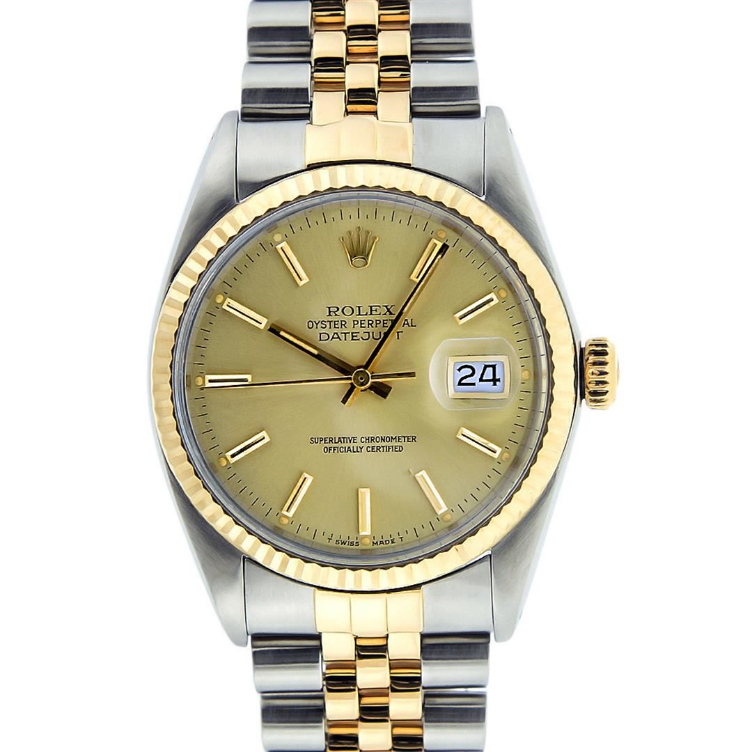 One Mens 14K Yellow Gold Two Tone Rolex Datejust Polished, Serviced & Electronically Tested, 14K Yellow Gold & Stainless Steel Case: 36mm, 14K Yellow Gold Crown, Bezel: 14K Yellow Gold Fluted Bezel. Custom Crystal: New Acrylic Cyclops Lens. Custom Hands: New Luminecent Hands. Movement: Automatic Winding Movement Caliber 3035. Dial: Champagne Index Dial With Dash Track & Lumi Dots. Date Window: 3 O'Clock Position Date Display, Quickset, Model: Datejust. Condition: G-6 Extra Fine. Bracelet: Two Tone 14K Yellow Gold & Stainless Steel Jubilee Band. Bright Polish. 7.0 Inch Length, Adjustable. Standard Clasp, With Rolex Logo. This Watch Has Been Serviced Time Tested And Is In Excellent Condition It Is Free Of All Scratches And Dents.