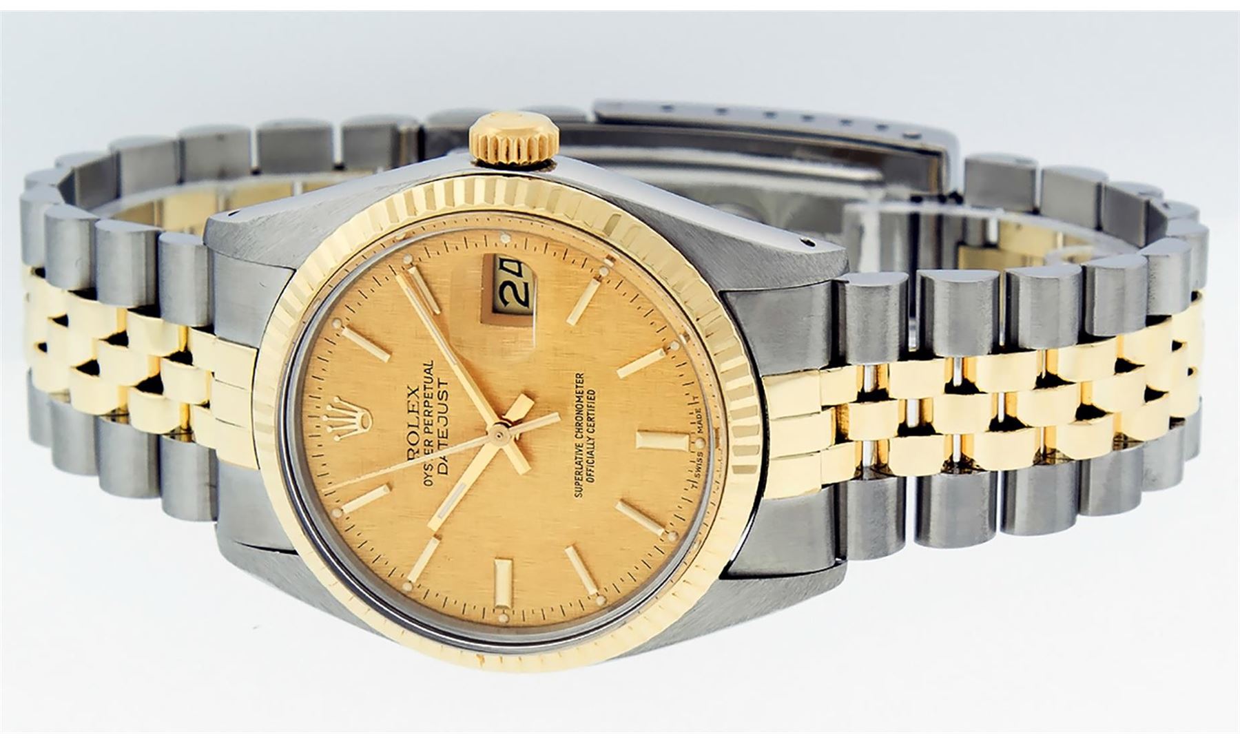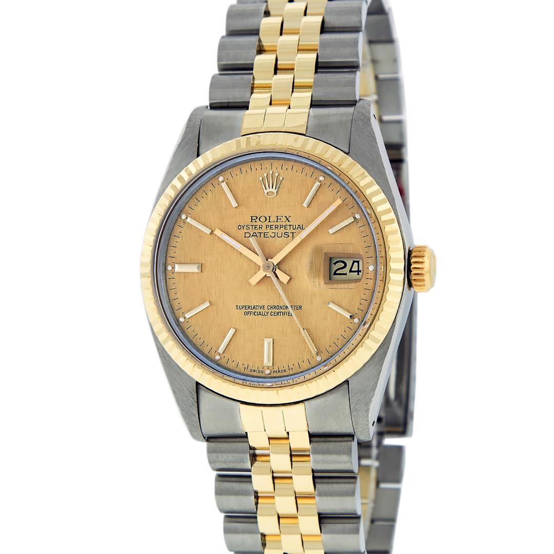 One Men's 14K Yellow Gold Two Tone Rolex Datejust Polished, Serviced & Electronically Tested, 14K Yellow Gold & Stainless Steel Case: 36mm, 14K Yellow Gold Crown, Bezel: 14K Yellow Gold Fluted Bezel. Custom Crystal: New Acrylic Cyclops Lens. Custom Hands: New Luminescent Hands. Movement: Automatic Winding Movement Caliber 3035. Dial: Champagne Linen Dial With Index Hour Markers and Small Track With Lumi Dots. Date Window: 3 O'Clock Position Date Display, Quickset, Model: Datejust. Condition: G-6 Extra Fine. Bracelet: Two Tone 14K Yellow Gold & Stainless Steel Jubilee Band. Bright Polish. 7.0 Inch Length, Adjustable. Standard Clasp, With Rolex Logo. This Watch Has Been Serviced Time Tested And Is In Excellent Condition It Is Free Of All Scratches And Dents.