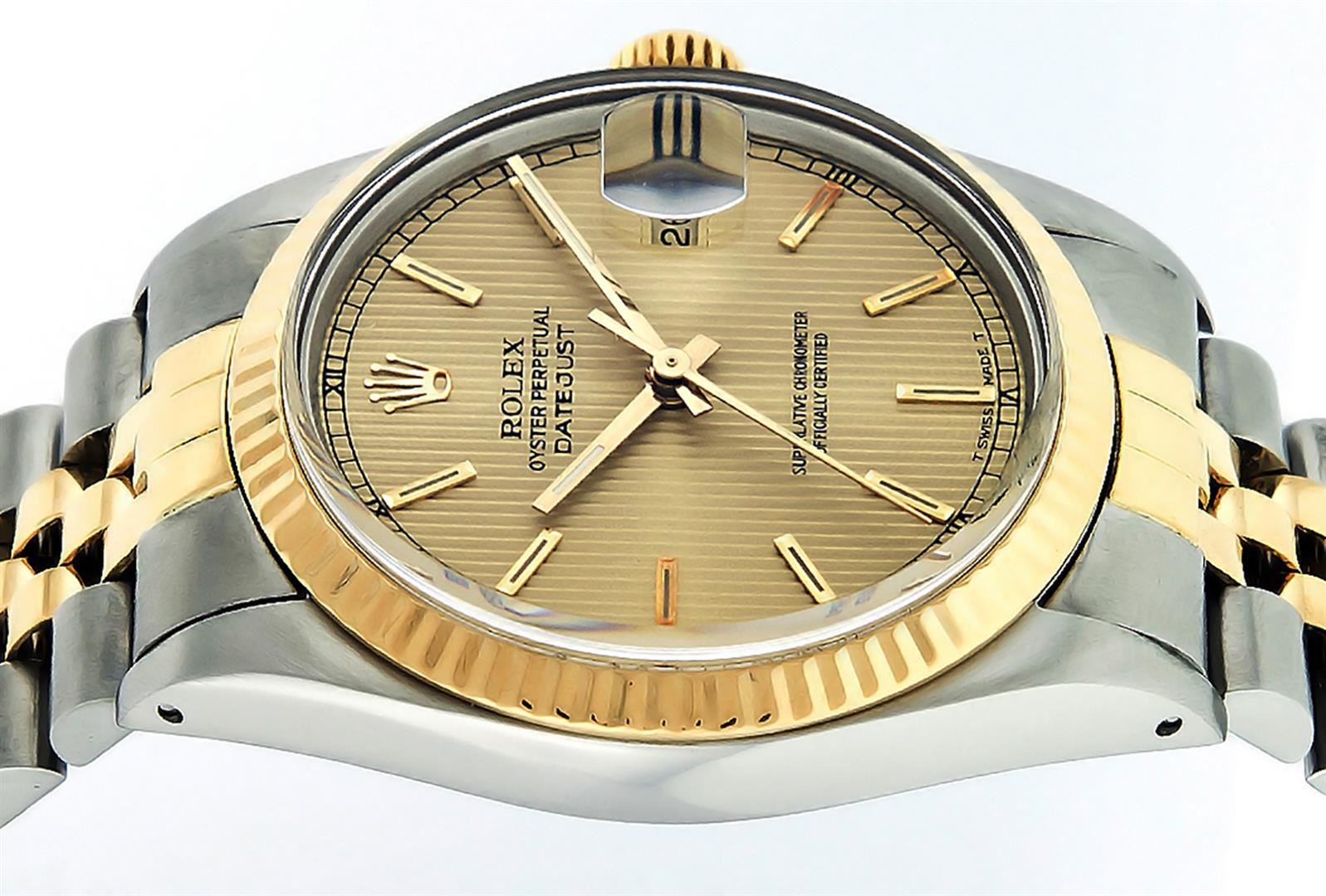 One Mens 14K Yellow Gold Two Tone Rolex Datejust Polished, Serviced & Electronically Tested, 14K Yellow Gold & Stainless Steel Case: 36mm, 14K Yellow Gold Crown, Bezel: 14K Yellow Gold Fluted Bezel. Custom Crystal: New Acrylic Cyclops Lens. Custom Hands: New Luminecent Hands. Movement: Automatic Winding Movement Caliber 3035. Dial: Champagne Tapestry Index Dial With Roman Square Track. Date Window: 3 O'Clock Position Date Display, Quickset, Model: 16013 Datejust. Condition: G-6 Extra Fine. Bracelet: Two Tone 14K Yellow Gold & Stainless Steel Jubilee. Bright Polish. 7.0 Inch Length, Adjustable. Standard Clasp, With Rolex Logo. This Watch Has Been Serviced Time Tested And Is In Excellent Condition It Is Free Of All Scratches And Dents.