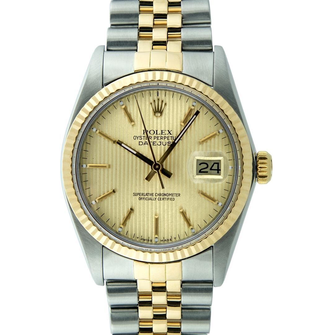 One Men's 14K Yellow Gold Two Tone Rolex Datejust Polished, Serviced & Electronically Tested, 14K Yellow Gold & Stainless Steel Case: 36mm,14K Yellow Gold Crown, Bezel: 14K Yellow Gold Fluted Bezel. Custom Crystal: New Acrylic Cyclops Lens. Custom Hands: New Luminescent Hands. Movement: Automatic Winding Movement Caliber 3035. Dial: Champagne Tapestry Dial With Index Hour Markers and Small Track With Lumi Dots. Date Window: 3 O'Clock Position Date Display, Quickset, Model: Datejust, Condition: G-6 Extra Fine. Bracelet: Two Tone 14K Yellow Gold & Stainless Steel Jubilee Band. Bright Polish. 7.0 Inch Length, Adjustable. Standard Clasp, With Rolex Logo. This Watch Has Been Serviced Time Tested And Is In Excellent Condition It Is Free Of All Scratches And Dents. This Watch Comes With A Rolex Box.