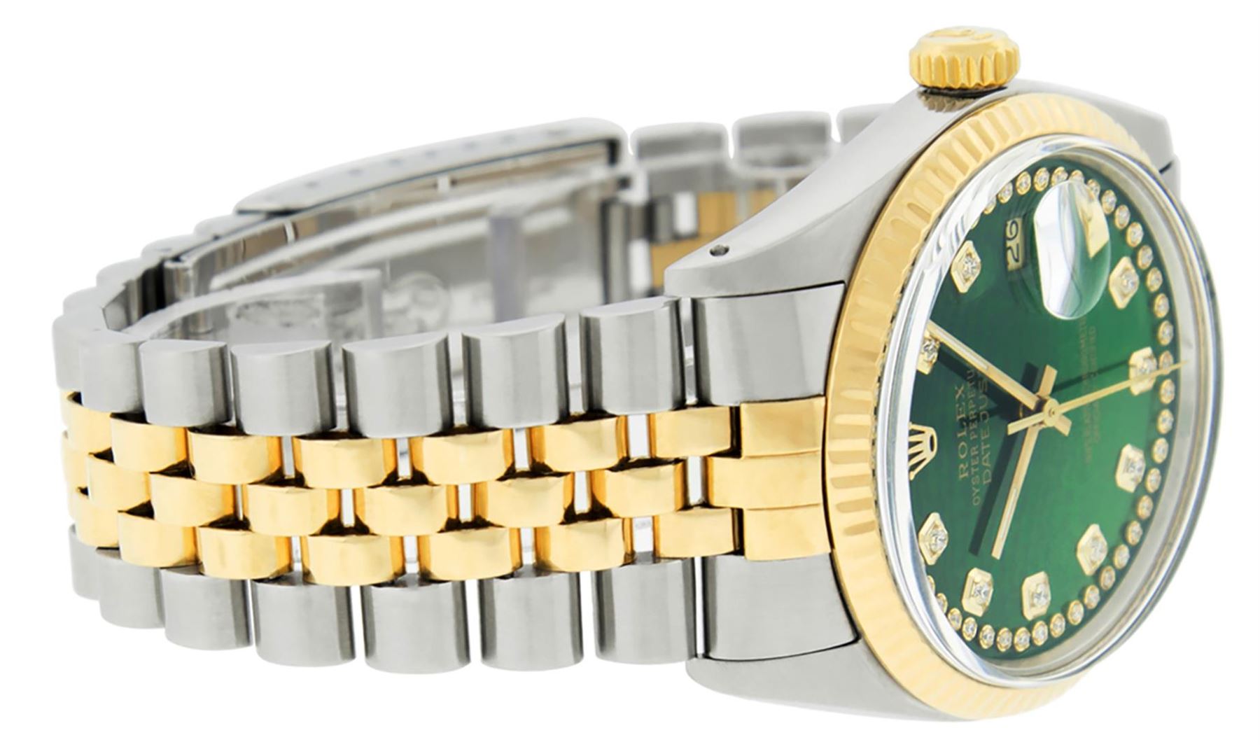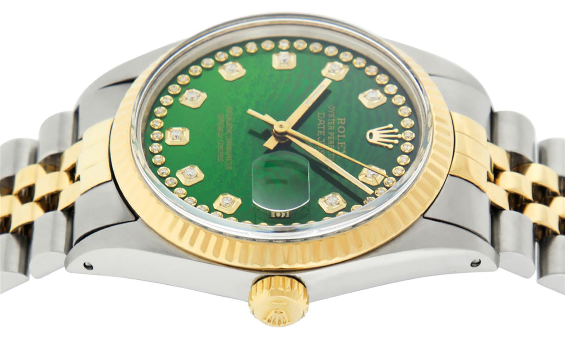 One Mens 14K Yellow Gold Two Tone Rolex Datejust Polished, Serviced & Electronically Tested, 14K Yellow Gold & Stainless Steel Case: 36mm, 14K Yellow Gold Crown, Bezel: 14K Yellow Gold Fluted Bezel. Custom Crystal: New Acrylic Cyclops Lens. Custom Hands: New Luminecent Hands. Movement: Automatic Winding Movement Caliber 3035. Custom Dial: Green String Dial Set With Diamond Hour Markers, Diamond Count: 58 Diamonds in Dial, G To H In Color, SI-VS Clarity. Date Window: 3 O'Clock Position Date Display, Quickset, Model: 16013 Datejust, Condition: G-6 Extra Fine. Bracelet: Two Tone 14K Yellow Gold & Stainless Steel Jubilee Band. Bright Polish. 7.0 Inch Length, Adjustable. Standard Clasp, With Rolex Logo. This Watch Has Been Serviced And Polished It Is Free Of All Scratches And Dents.