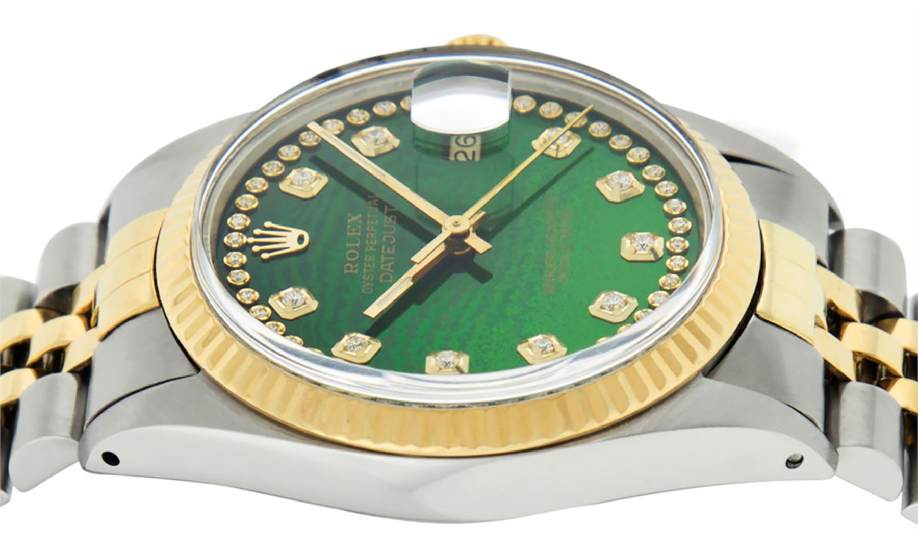 One Mens 14K Yellow Gold Two Tone Rolex Datejust Polished, Serviced & Electronically Tested, 14K Yellow Gold & Stainless Steel Case: 36mm, 14K Yellow Gold Crown, Bezel: 14K Yellow Gold Fluted Bezel. Custom Crystal: New Acrylic Cyclops Lens. Custom Hands: New Luminecent Hands. Movement: Automatic Winding Movement Caliber 3035. Custom Dial: Green String Dial Set With Diamond Hour Markers, Diamond Count: 58 Diamonds in Dial, G To H In Color, SI-VS Clarity. Date Window: 3 O'Clock Position Date Display, Quickset, Model: 16013 Datejust, Condition: G-6 Extra Fine. Bracelet: Two Tone 14K Yellow Gold & Stainless Steel Jubilee Band. Bright Polish. 7.0 Inch Length, Adjustable. Standard Clasp, With Rolex Logo. This Watch Has Been Serviced And Polished It Is Free Of All Scratches And Dents.