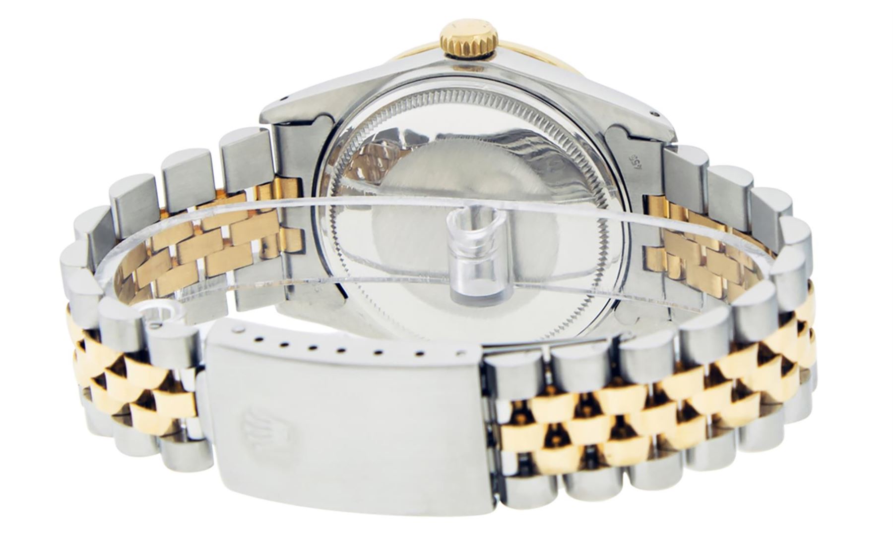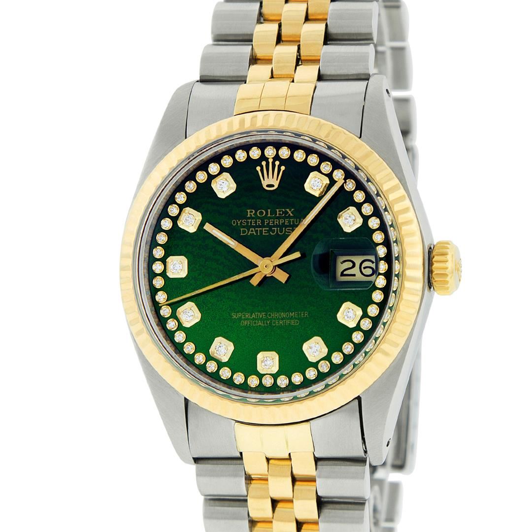 One Mens 14K Yellow Gold Two Tone Rolex Datejust Polished, Serviced & Electronically Tested, 14K Yellow Gold & Stainless Steel Case: 36mm, 14K Yellow Gold Crown, Bezel: 14K Yellow Gold Fluted Bezel. Custom Crystal: New Acrylic Cyclops Lens. Custom Hands: New Luminecent Hands. Movement: Automatic Winding Movement Caliber 3035. Custom Dial: Green String Dial Set With Diamond Hour Markers, Diamond Count: 58 Diamonds in Dial, G To H In Color, SI-VS Clarity. Date Window: 3 O'Clock Position Date Display, Quickset, Model: 16013 Datejust, Condition: G-6 Extra Fine. Bracelet: Two Tone 14K Yellow Gold & Stainless Steel Jubilee Band. Bright Polish. 7.0 Inch Length, Adjustable. Standard Clasp, With Rolex Logo. This Watch Has Been Serviced And Polished It Is Free Of All Scratches And Dents.