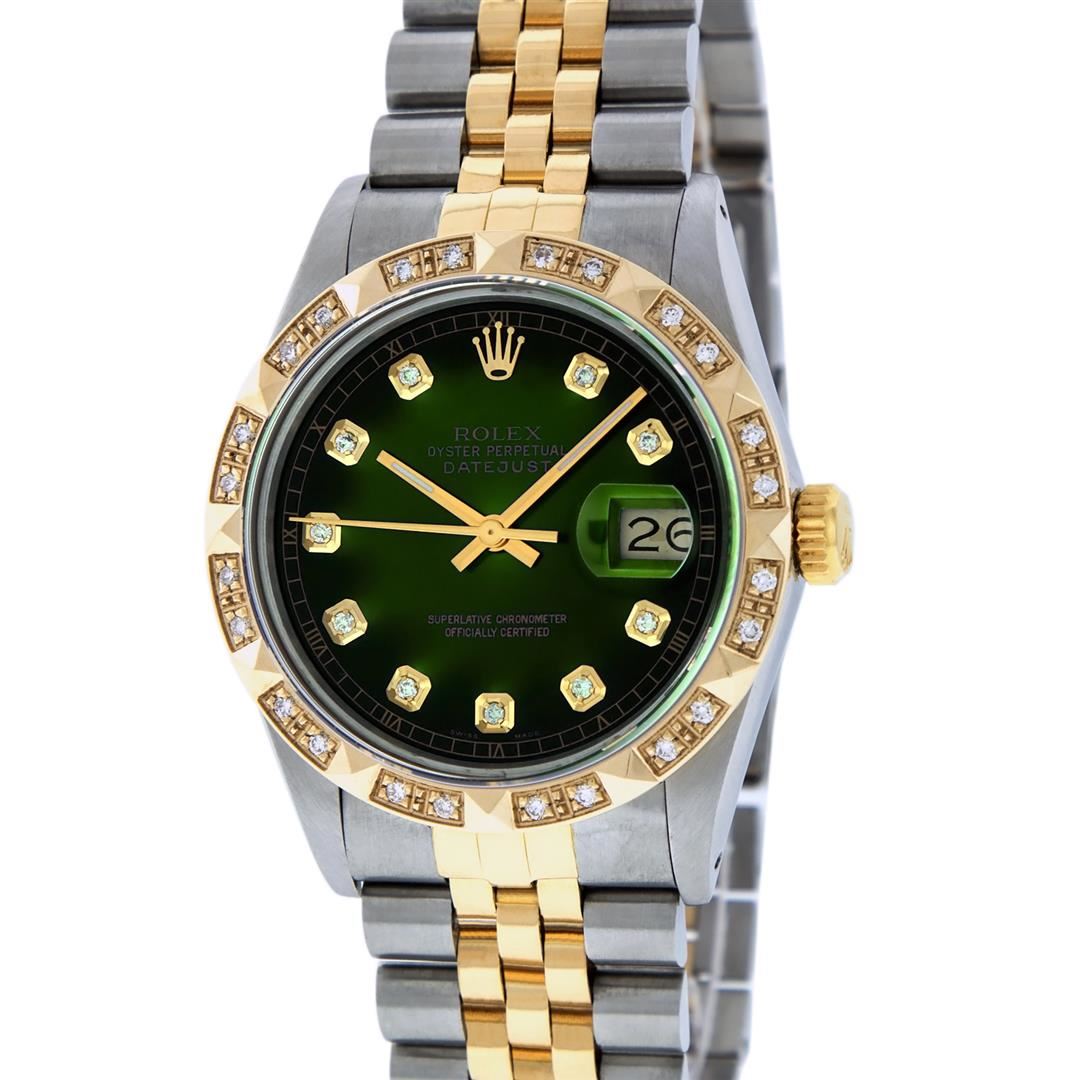 One Mens 14K Yellow Gold Rolex Datejust Polished Bright with Satin Finish, Serviced & Electronically Tested, Stainless Steel Case: 36mm, Yellow Gold Crown, Custom Bezel: New 18K Yellow Gold Pyramid Diamond Bezel, Diamond Count: 24 Diamonds, Total Weight .75 Carat, Clarity: SI-VS, Color: G to H. Custom Crystal: New Scratch Resistant Synthetic Sapphire Cyclops Lens. Custom Hands: New Luminecent Hands. Movement: Automatic Winding Movement Caliber 3035. Custom Dial: Green Vignette Diamond Dial, Diamond Count: 10 Diamonds In Dial, Color: G to H, Clarity: VS. Date Window: 3 O'Clock Position Date Display, Quickset, Model: Datejust. Condition: G-6 Extra Fine. Bracelet: 14K Yellow Gold And Stainless Steel Jubilee Band. Bright Polish & Satin Finish. 7.0 Inch Length, Adjustable. Standard Clasp, With Rolex Logo. This Watch Has Been Serviced And Polished It Is Free Of All Scratches And Dents.