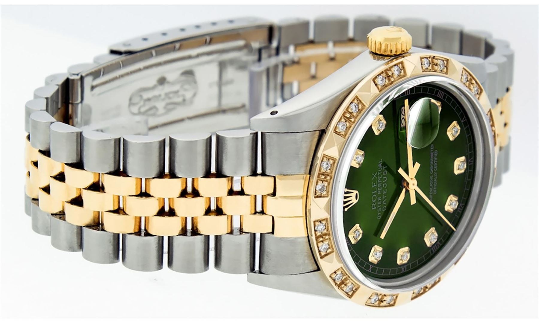 Rolex Mens Two Tone 14K Green Vignette Pyramid Diamond 36MM Datejust Wristwatch