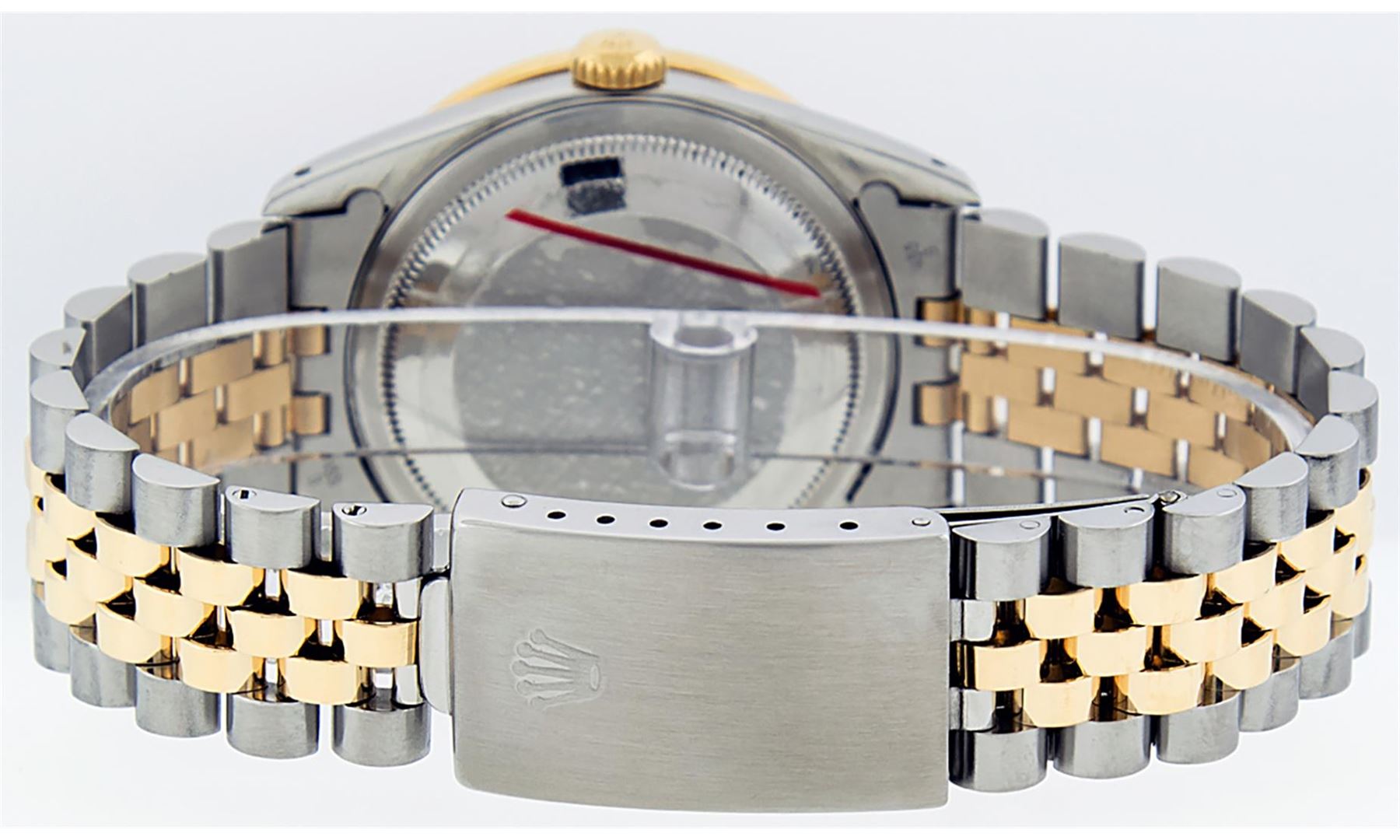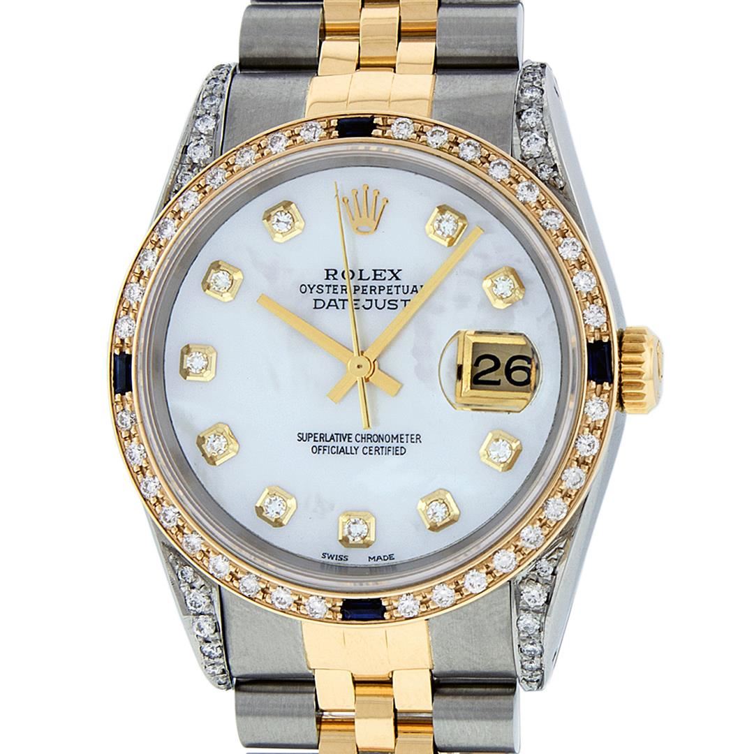 One Mens 14K Yellow Gold Rolex Datejust Polished Bright with Satin Finish, Serviced & Electronically Tested, Stainless Steel Case: 36mm, Custom Diamond Lugs: 28 Diamonds In Lugs, Color: G to H, Clarity: SI-VS. Yellow Gold Crown, Custom Bezel: New 18K Yellow Gold Sapphire + Diamond Bezel, Stone Count: 36 Diamonds + 4 Sapphires, Total Weight 1.00 Carat, Clarity: SI-VS, Color: G to H. Custom Crystal: New Scratch Resistant Synthetic Sapphire Cyclops Lens. Custom Hands: New Luminecent Hands. Movement: Automatic Winding Movement Caliber 3035. Custom Dial: Mother Of Pearl Diamond, Stone Count: 10 Diamonds In Dial, Color: G to H, Clarity: VS. Date Window: 3 O'Clock Position Date Display, Quickset, Model: Datejust. Condition: G-6 Extra Fine. Bracelet: 14K Yellow Gold And Stainless Steel Jubilee Band. Bright Polish & Satin Finish. 7.0 Inch Length, Adjustable. Standard Clasp, With Rolex Logo. This Watch Has Been Serviced And Polished It Is Free Of All Scratches And Dents.