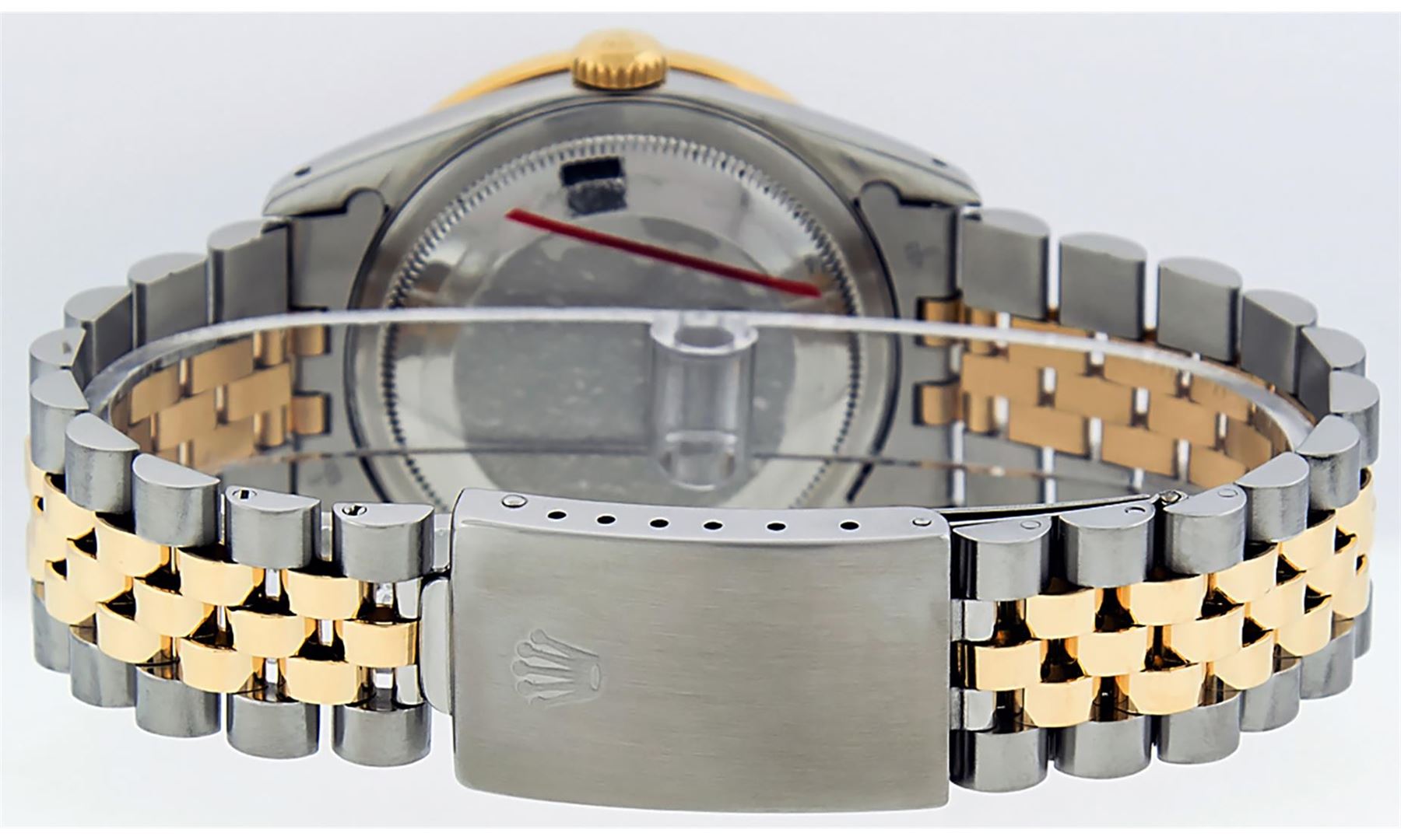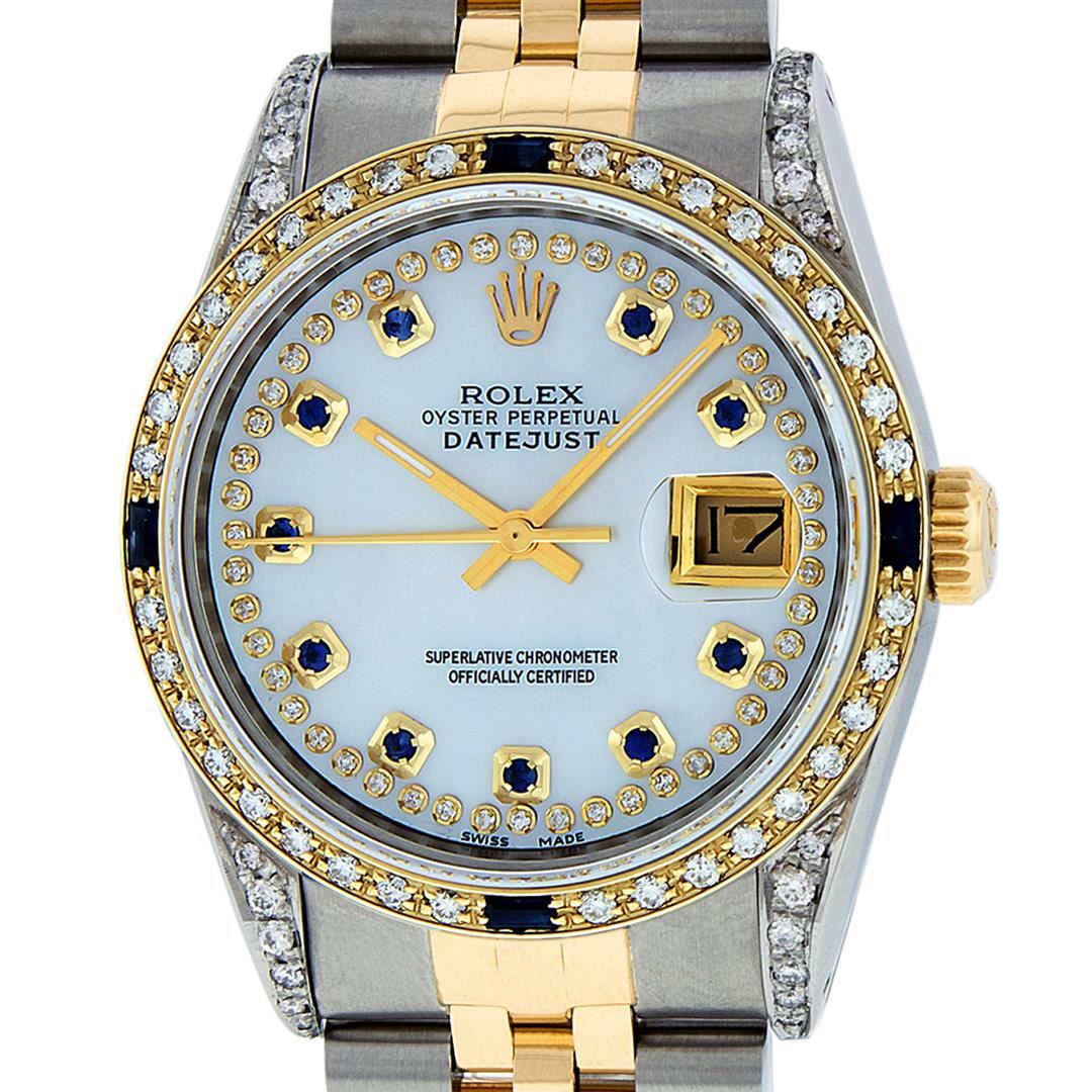 One Mens 14K Yellow Gold Rolex Datejust Polished Bright with Satin Finish, Serviced & Electronically Tested, Stainless Steel Case: 36mm, Custom Diamond Lugs: 28 Diamonds In Lugs, Color: G to H, Clarity: SI-VS. Yellow Gold Crown, Custom Bezel: New 18K Yellow Gold Beadset + Sapphire Diamond Bezel, Stone Count: 36 Diamonds + 4 Sapphires, Total Weight 1.00 Carat, Clarity: SI-VS, Color: G to H. Custom Crystal: New Scratch Resistant Synthetic Sapphire Cyclops Lens. Custom Hands: New Luminecent Hands. Movement: Automatic Winding Movement Caliber 3035. Custom Dial: Mother Of Pearl Sapphire String Diamond, Stone Count: 48 Diamonds + 10 Sapphires In Dial, Color: G to H, Clarity: VS. Date Window: 3 O'Clock Position Date Display, Quickset, Model: Datejust. Condition: G-6 Extra Fine. Bracelet: 14K Yellow Gold And Stainless Steel Jubilee Band. Bright Polish & Satin Finish. 7.0 Inch Length, Adjustable. Standard Clasp, With Rolex Logo. This Watch Has Been Serviced And Polished It Is Free Of All Scratches And Dents.