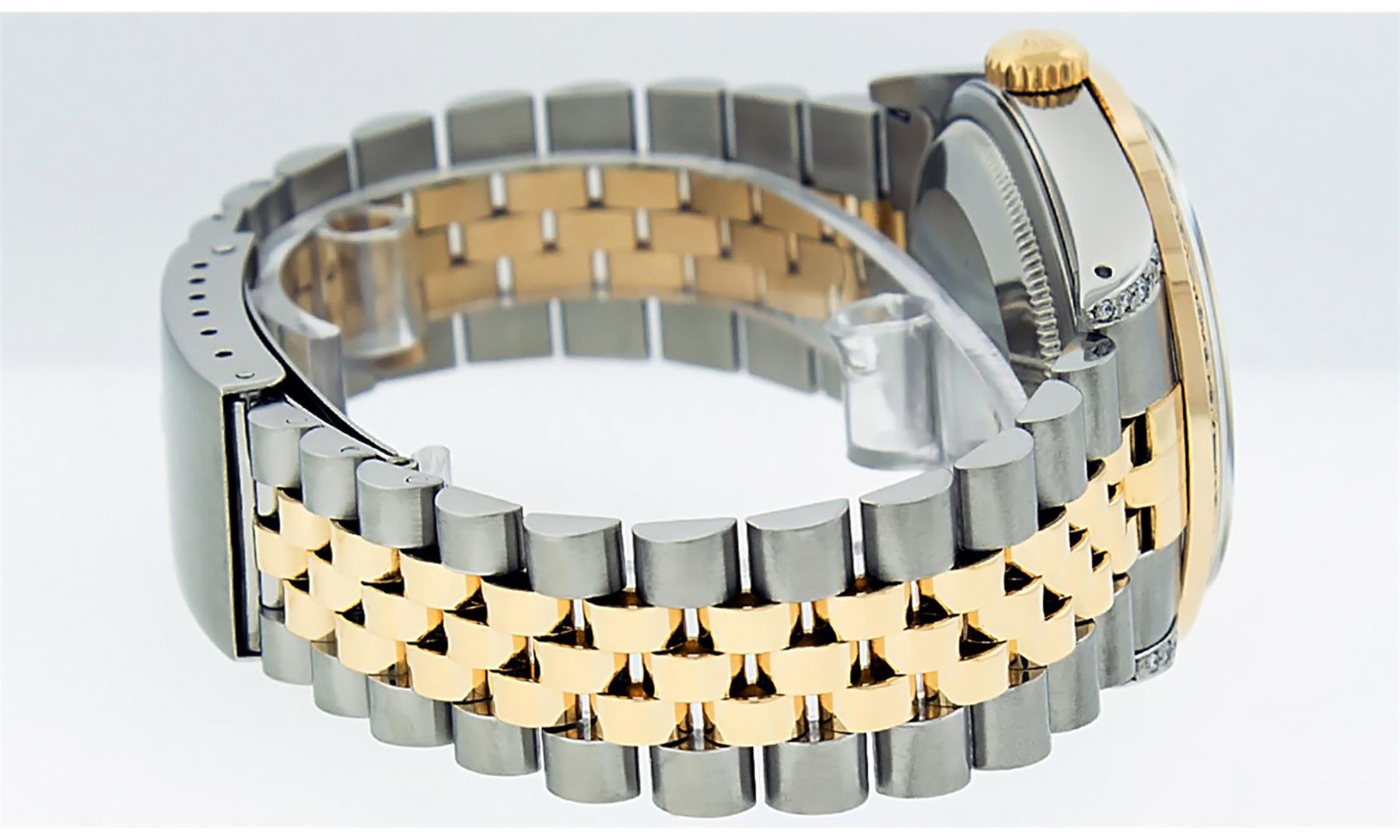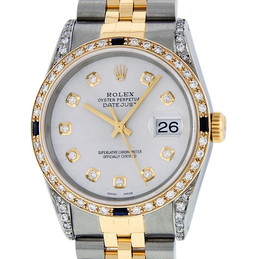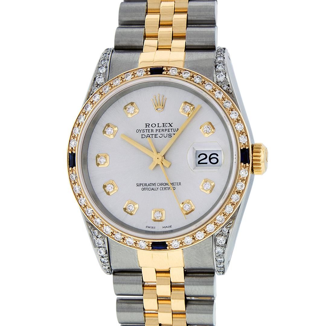 One Mens 14K Yellow Gold Rolex Datejust Polished Bright with Satin Finish, Serviced & Electronically Tested, Stainless Steel Case: 36mm, Custom Diamond Lugs: 28 Diamonds In Lugs, Color: G to H, Clarity: SI-VS. Yellow Gold Crown, Custom Bezel: New 18K Yellow Gold Sapphire + Diamond Bezel, Stone Count: 36 Diamonds + 4 Sapphires, Total Weight 1.00 Carat, Clarity: SI-VS, Color: G to H. Custom Crystal: New Scratch Resistant Synthetic Sapphire Cyclops Lens. Custom Hands: New Luminecent Hands. Movement: Automatic Winding Movement Caliber 3035. Custom Dial: Silver Diamond Dial, Stone Count: 10 Diamonds In Dial, Color: G to H, Clarity: VS. Date Window: 3 O'Clock Position Date Display, Quickset, Model: Datejust. Condition: G-6 Extra Fine. Bracelet: 14K Yellow Gold And Stainless Steel Jubilee Band. Bright Polish & Satin Finish. 7.0 Inch Length, Adjustable. Standard Clasp, With Rolex Logo. This Watch Has Been Serviced And Polished It Is Free Of All Scratches And Dents.