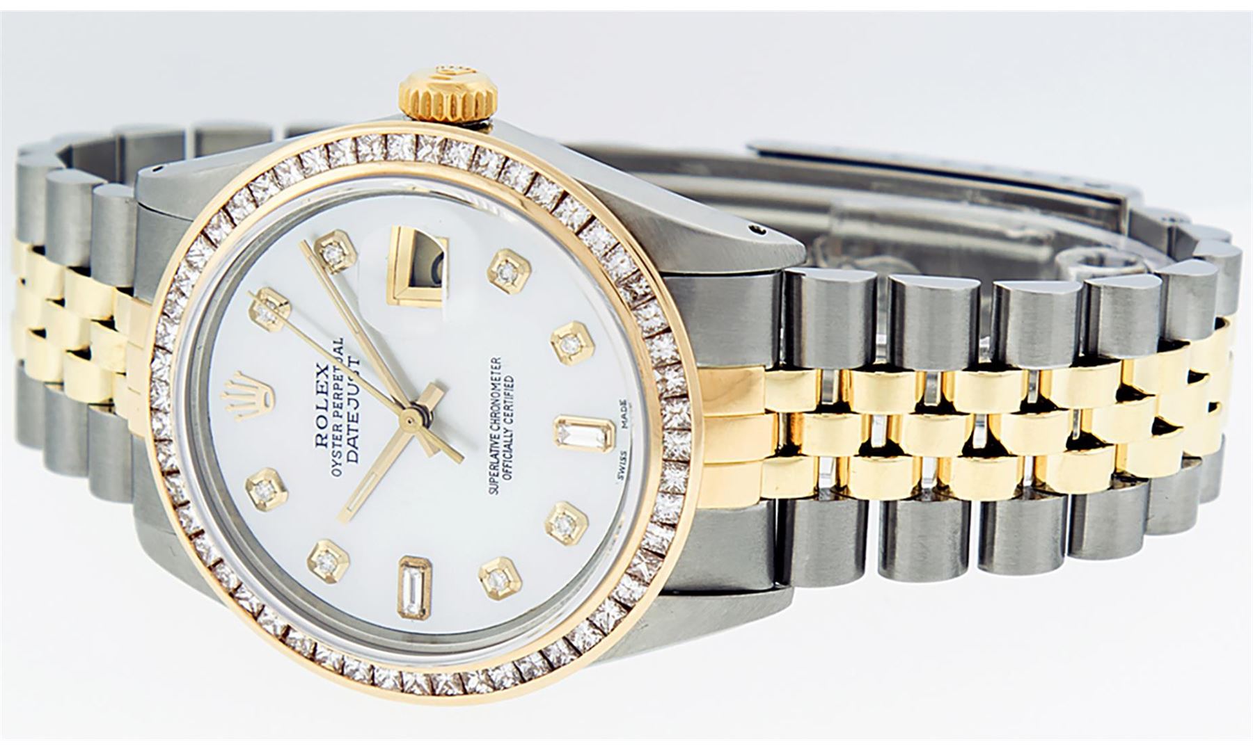 One Mens 14K Yellow Gold Two Tone Rolex Datejust Polished Bright with Satin Finish, Serviced & Electronically Tested, 14K Yellow Gold And Stainless Steel Case: 36mm, 14K Yellow Gold Crown, Custom Bezel: New 14K Yellow Gold Princess Cut Diamond Bezel, Diamond Count: 53 Diamonds In Bezel, Total Weight 2.75 Carat, Clarity: SI-VS, Color: G to H. Custom Crystal: New Scratch Resistant Synthetic Sapphire Cyclops Lens. Custom Hands: New Luminecent Hands. Movement: Automatic Winding Movement Caliber 3035. Custom Dial: Mother Of Pearl 8 + 2 Diamond Dial, Diamond Count: 8 + 2 Baguette Diamonds in Dial, Dial Color: G To H In Color, Clarity: VS2. Date Window: 3 O'Clock Position Date Display, Quickset, Model: 16013 Datejust. Condition: G-6 Extra Fine. Bracelet: 14K Yellow Gold And Stainless Steel Jubilee Band. Bright Polish & Satin Finish. 7.0 Inch Length, Adjustable. Standard Clasp, With Rolex Logo. This Watch Has Been Serviced and Polished And It Is Free Of All Dents And Scratches And Has Been Time Tested.