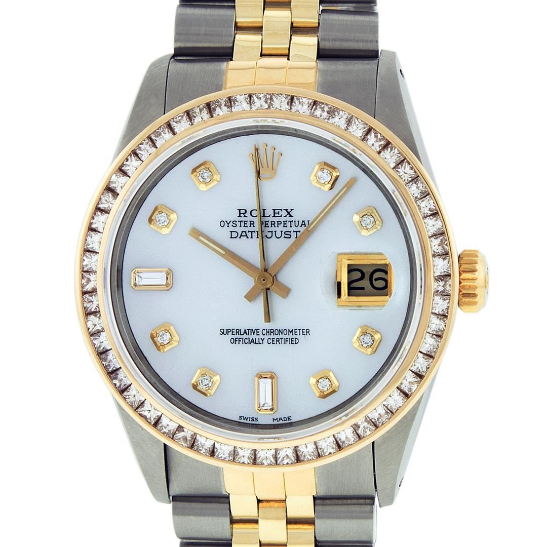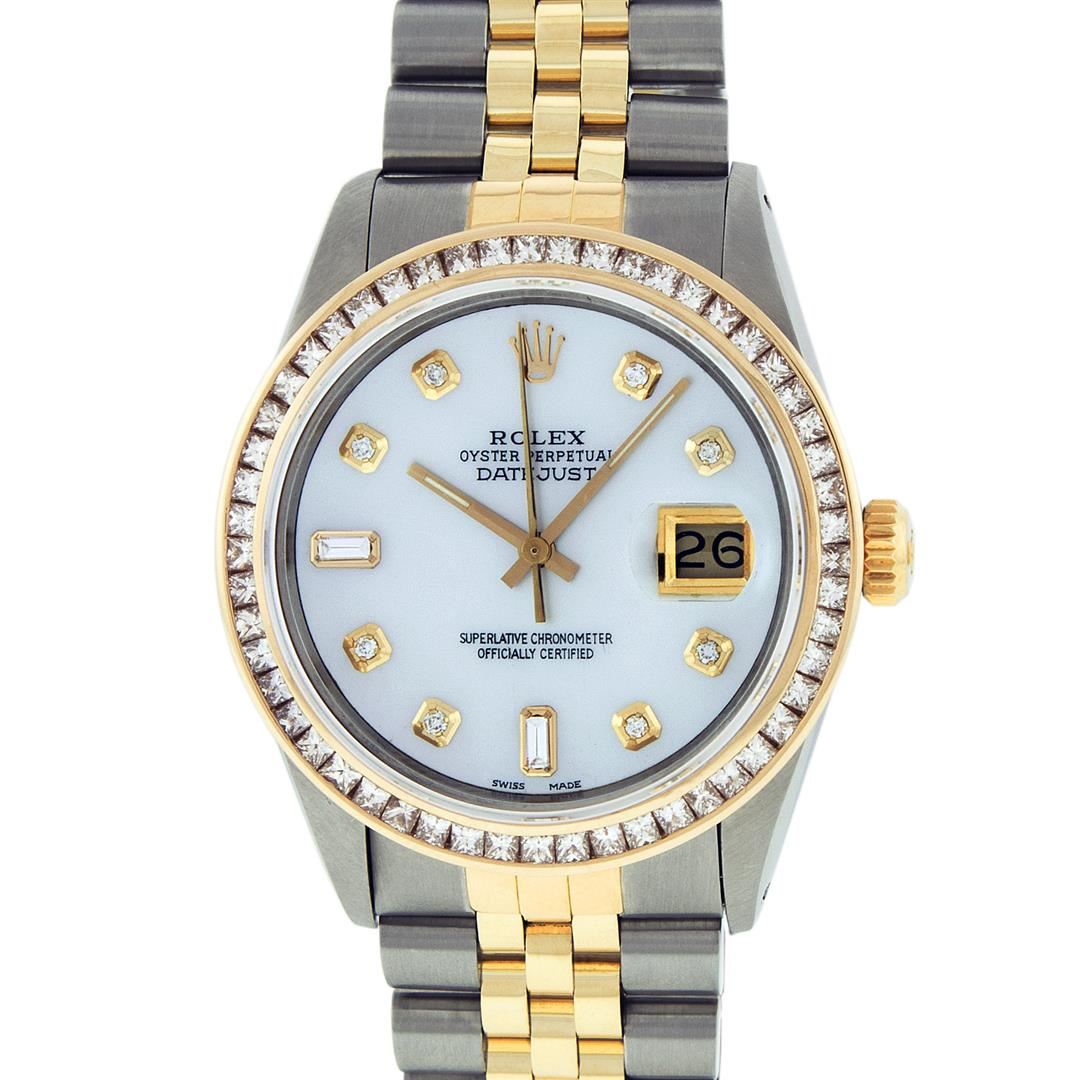 One Mens 14K Yellow Gold Two Tone Rolex Datejust Polished Bright with Satin Finish, Serviced & Electronically Tested, 14K Yellow Gold And Stainless Steel Case: 36mm, 14K Yellow Gold Crown, Custom Bezel: New 14K Yellow Gold Princess Cut Diamond Bezel, Diamond Count: 53 Diamonds In Bezel, Total Weight 2.75 Carat, Clarity: SI-VS, Color: G to H. Custom Crystal: New Scratch Resistant Synthetic Sapphire Cyclops Lens. Custom Hands: New Luminecent Hands. Movement: Automatic Winding Movement Caliber 3035. Custom Dial: Mother Of Pearl 8 + 2 Diamond Dial, Diamond Count: 8 + 2 Baguette Diamonds in Dial, Dial Color: G To H In Color, Clarity: VS2. Date Window: 3 O'Clock Position Date Display, Quickset, Model: 16013 Datejust. Condition: G-6 Extra Fine. Bracelet: 14K Yellow Gold And Stainless Steel Jubilee Band. Bright Polish & Satin Finish. 7.0 Inch Length, Adjustable. Standard Clasp, With Rolex Logo. This Watch Has Been Serviced and Polished And It Is Free Of All Dents And Scratches And Has Been Time Tested.