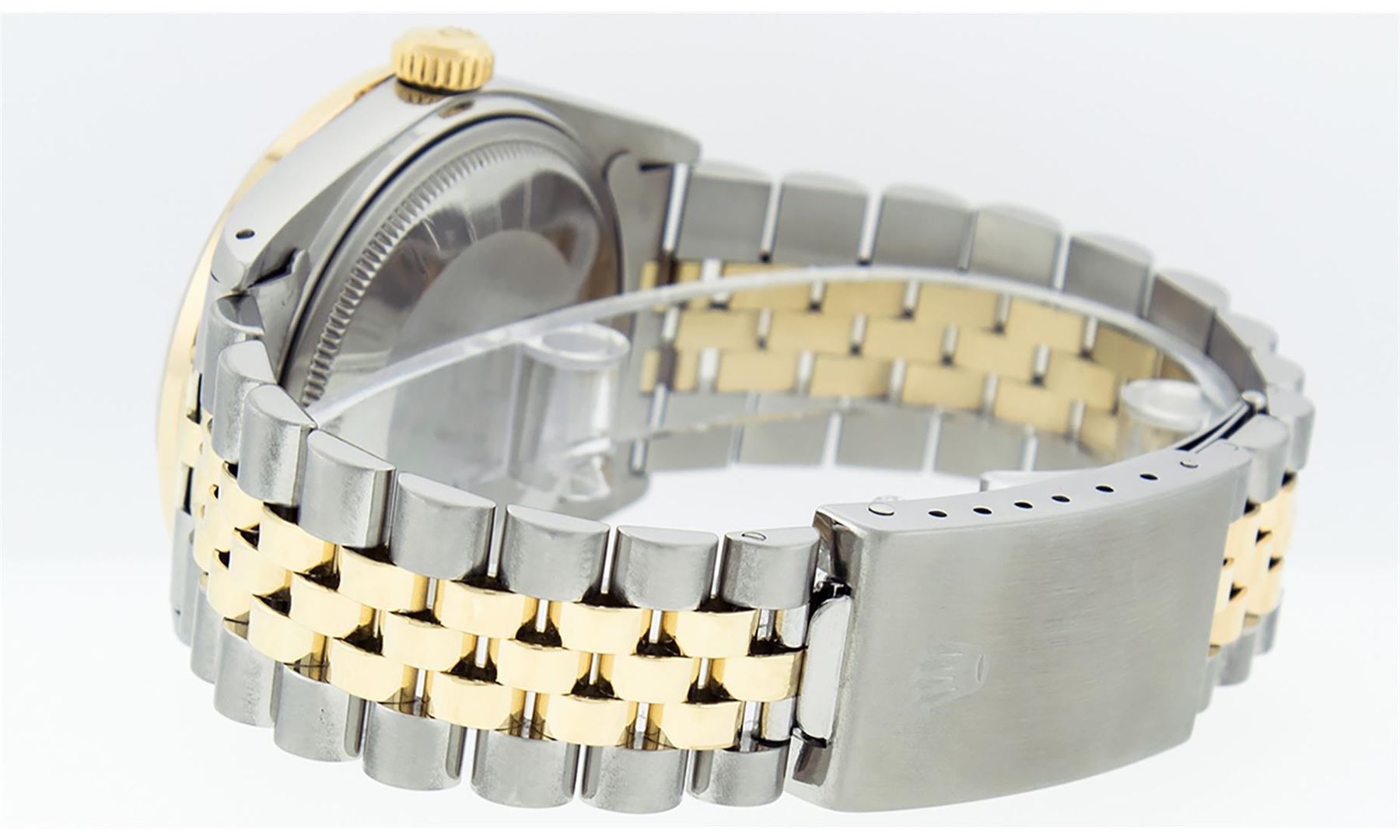 One Mens 14K Yellow Gold Two Tone Rolex Datejust Polished, Serviced & Electronically Tested, 14K Yellow Gold & Stainless Steel Case: 36mm, 14K Yellow Gold Crown, Custom Bezel: New 18K Yellow Gold Beadset & Ruby Diamond Bezel, Stone Count: 36 Diamonds + 4 Rubies, Total Weight 1.00 Carat, Clarity: SI-VS, Color: G to H. Custom Crystal: New Synthetic Sapphire Cyclops Lens. Custom Hands: New Luminecent Hands. Movement: Automatic Winding Movement Caliber 3035. Custom Dial: Mother Of Pearl Roman Dial With Square Track. Date Window: 3 O'Clock Position Date Display, Quickset, Model: 16013 Datejust. Condition: G-6 Extra Fine. Bracelet: Two Tone 14K Yellow Gold & Stainless Steel Jubilee. Bright Polish. 7.0 Inch Length, Adjustable. Standard Clasp, With Rolex Logo. This Watch Has Been Serviced Time Tested And Is In Excellent Condition It Is Free Of All Scratches And Dents.